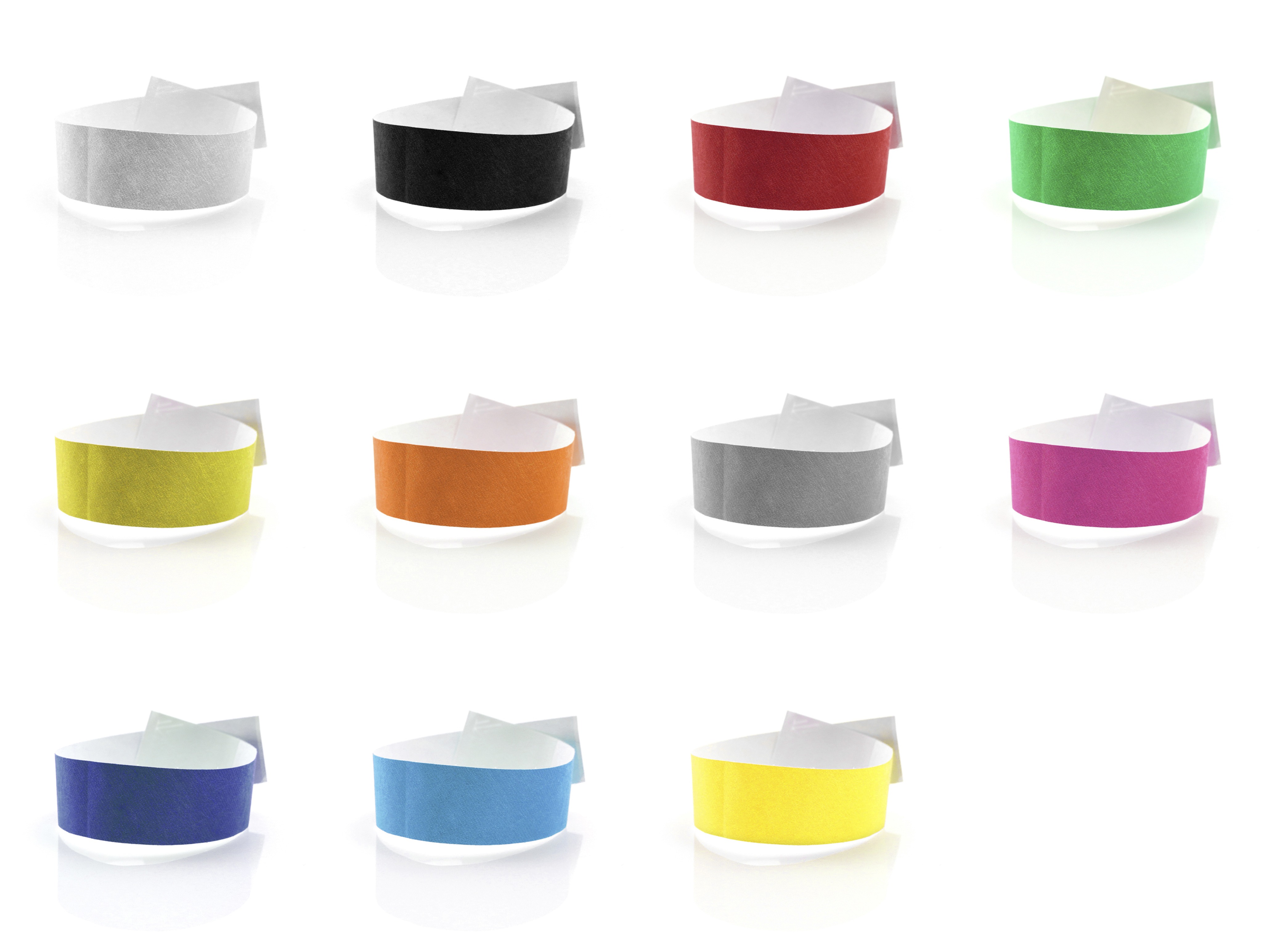 Pulsera para eventos en fibra sintética y variada gama de vivos colores. Con cierre adhesivo, resistente al agua y presentada en plancha troquelada de 10 piezas con numeración individual.