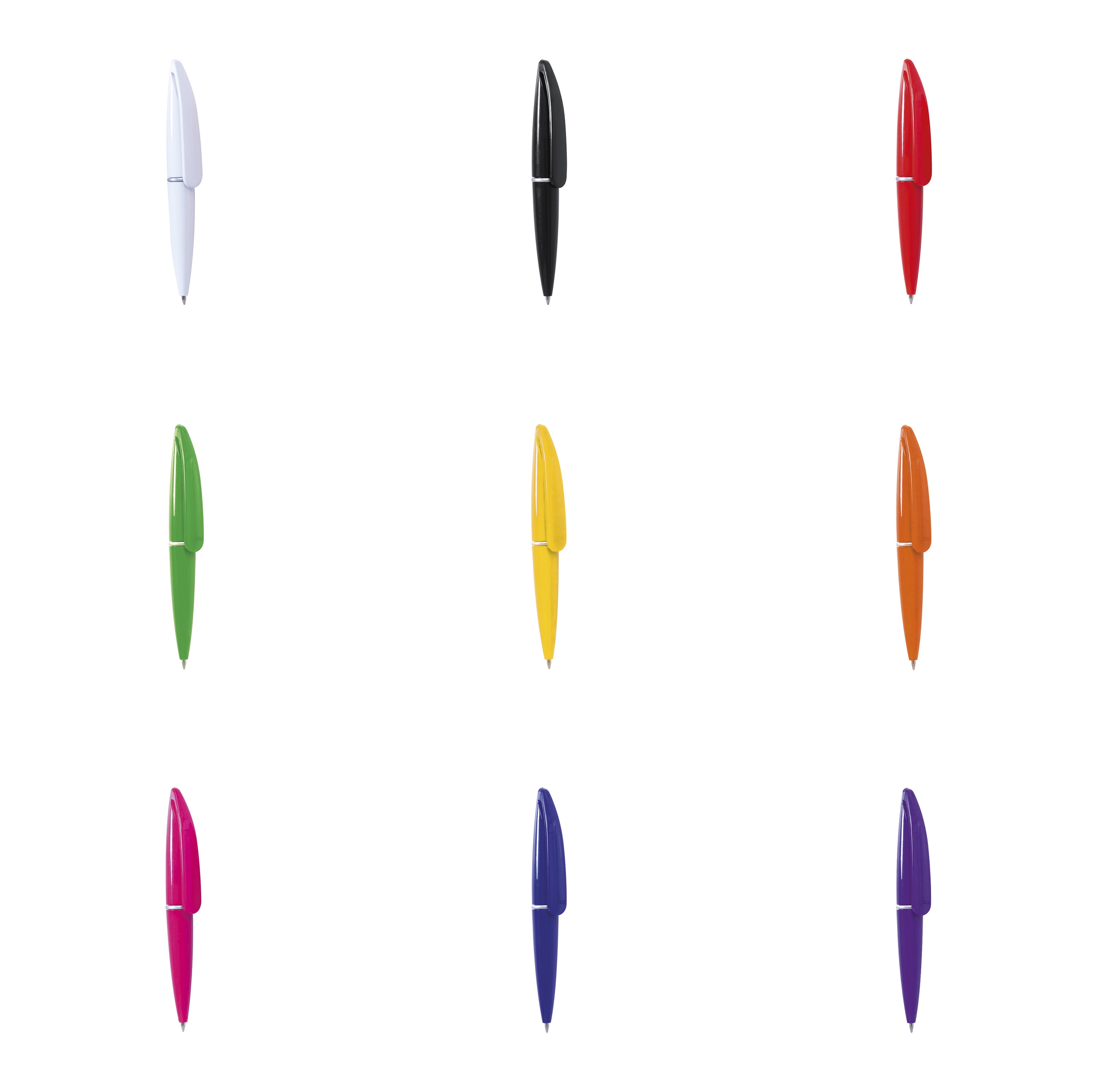 Mini bolígrafo de mecanismo giratorio en llamativos colores sólidos. Con original clip de gran tamaño y anilla central en color plateado. Tinta azul.