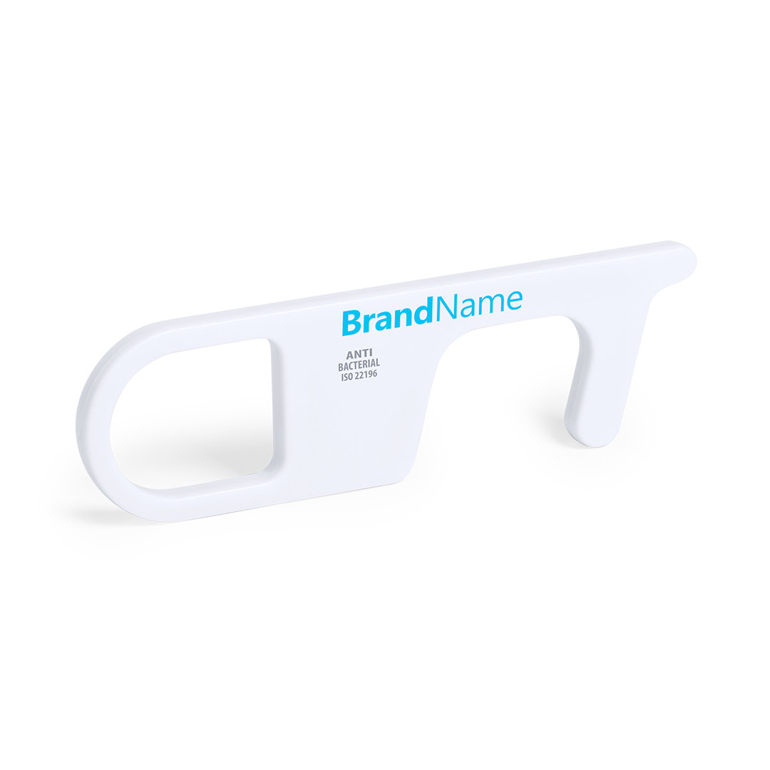 Llavero higiénico antibacteriano y anti-contacto, fabricado en resistente ABS de acabado sólido. Especialmente diseñado para evitar tocar con las manos superficies de uso común (manivelas de puertas, interruptores, grifos de uso público, cajeros automáticos...). Con cómodo troquel para el dedo y presentado en bolsita individual. Recomendado para marcaje en tampografía. Los productos con tratamientos antibacterianos son capaces de reducir drásticamente las cargas bacterianas presentes en las superficies de los materiales, gracias a la incorporación de agentes microbianos permanentes estáticos, con alta efectividad para inhibir y prevenir la contaminación bacteriana. Artículo de acuerdo al estándar ISO 22196, que determina la actividad antibacteriana en materiales plásticos y superficies no porosas, lo que permite conocer la efectividad de inhibición microbiana que tienen los aditivos sobre los objetos tratados mediante una evaluación cuantitativa.