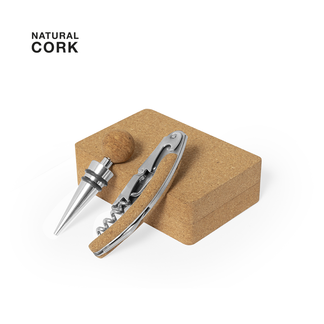Set de vinos acabado en corcho. Accesorios de acero inox. Incluye sacacorchos de dos tiempos y tapón. Presentado en estuche individual de corcho, con interior troquelado y fijación con imanes..Elaborado con elementos vegetales para así fomentar la utilización de materias primas naturales y reducir las emisiones contaminantes.