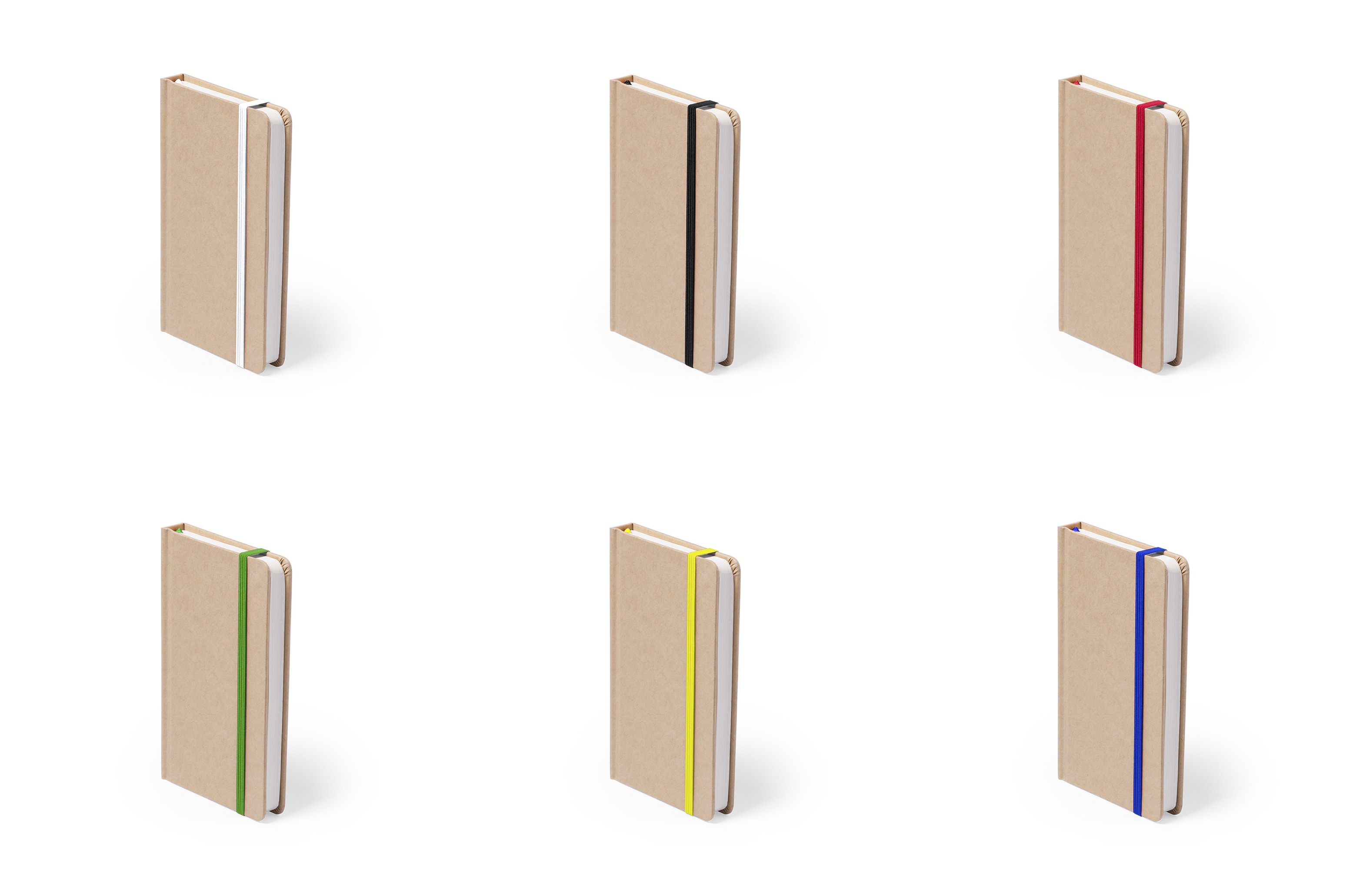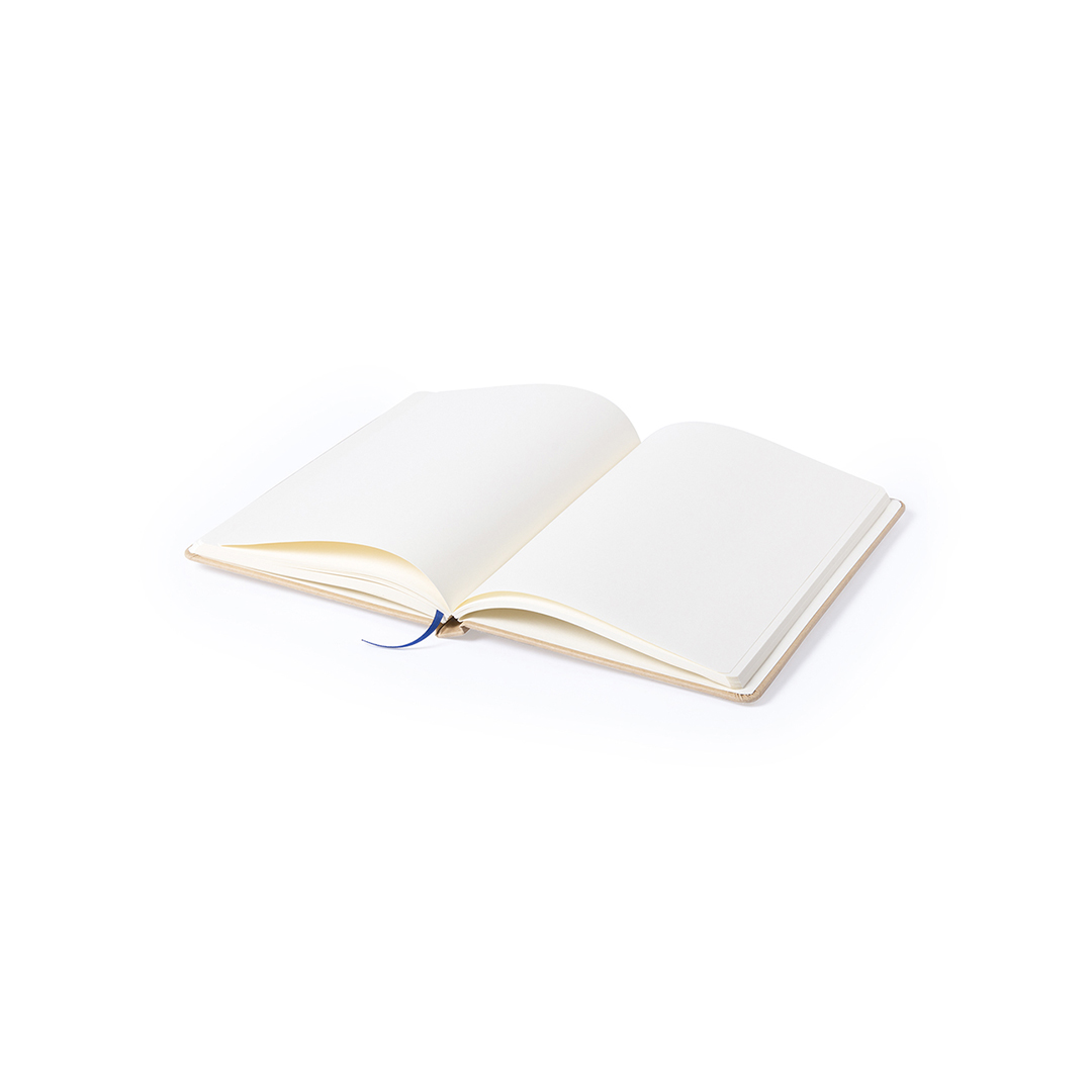 Bloc de notas con tapas de suave tacto acabadas en resistente cartón natural. De 100 hojas lisas, con elástico de sujeción y marcapáginas de tela a juego.