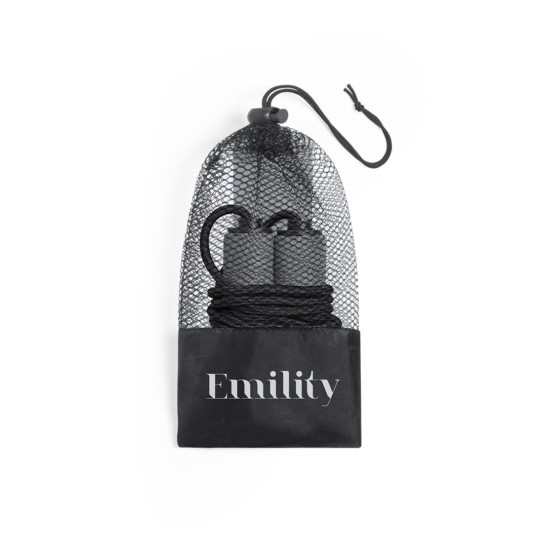 Set de goma elástica y comba para los más deportistas. Incluye: 1 cinta de 25x5 cm fabricada en resistente material TPE y resistencia media 1 comba de 260 cm, con mangos en resistente material HIPS forrados en EVA. Presentado en funda de poliéster con cierre de cordón y accesorio de ajuste.
