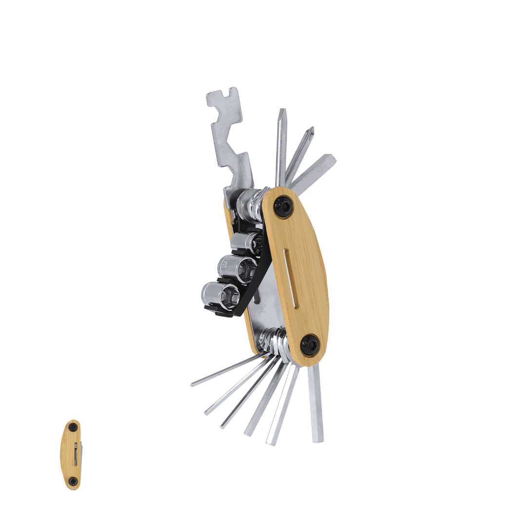 Multiherramienta en resistente acero inox con carcasa de bambú. Con 15 funciones:- Llaves Allen- Llaves Hexagonales- Destornillador plano- Destornillador estrella- Destornillador Phillips- Adaptador de tubo para tuercas hexagonales - Llaves de vasoMateriales como el bambú fomentan la utilización de materias primas naturales, reduciendo las emisiones contaminantes. Proviene de una planta de gran resistencia y versatilidad, con crecimiento y regeneración rápidos, siendo una excelente alternativa al uso de madera tradicional.