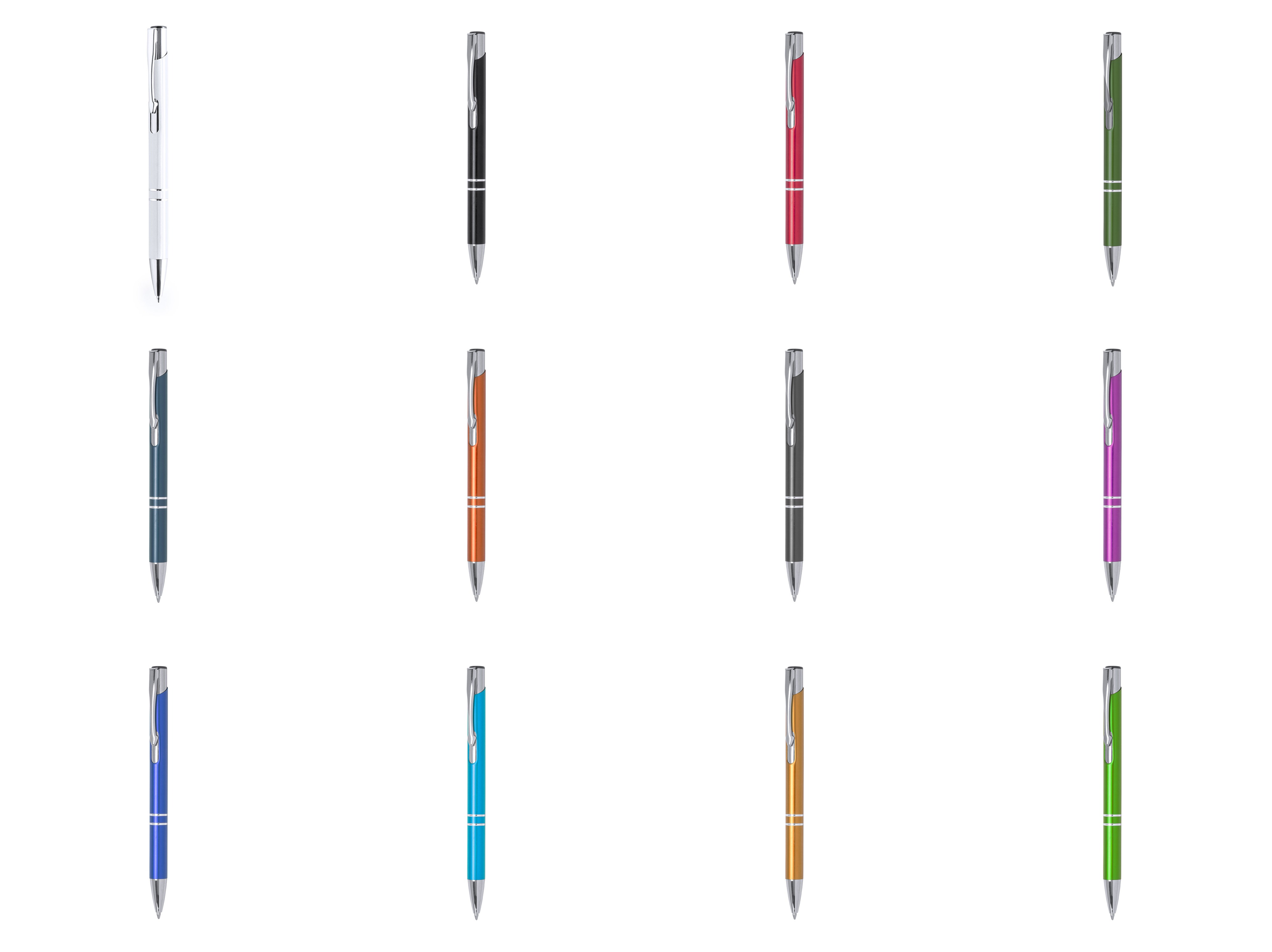 Original bolígrafo de mecanismo pulsador en elegante diseño bicolor. Con cuerpo troquelado en aluminio de suave acabado en variados colores. Original clip, anillas y punta en plateado. De cartucho jumbo y tinta azul.