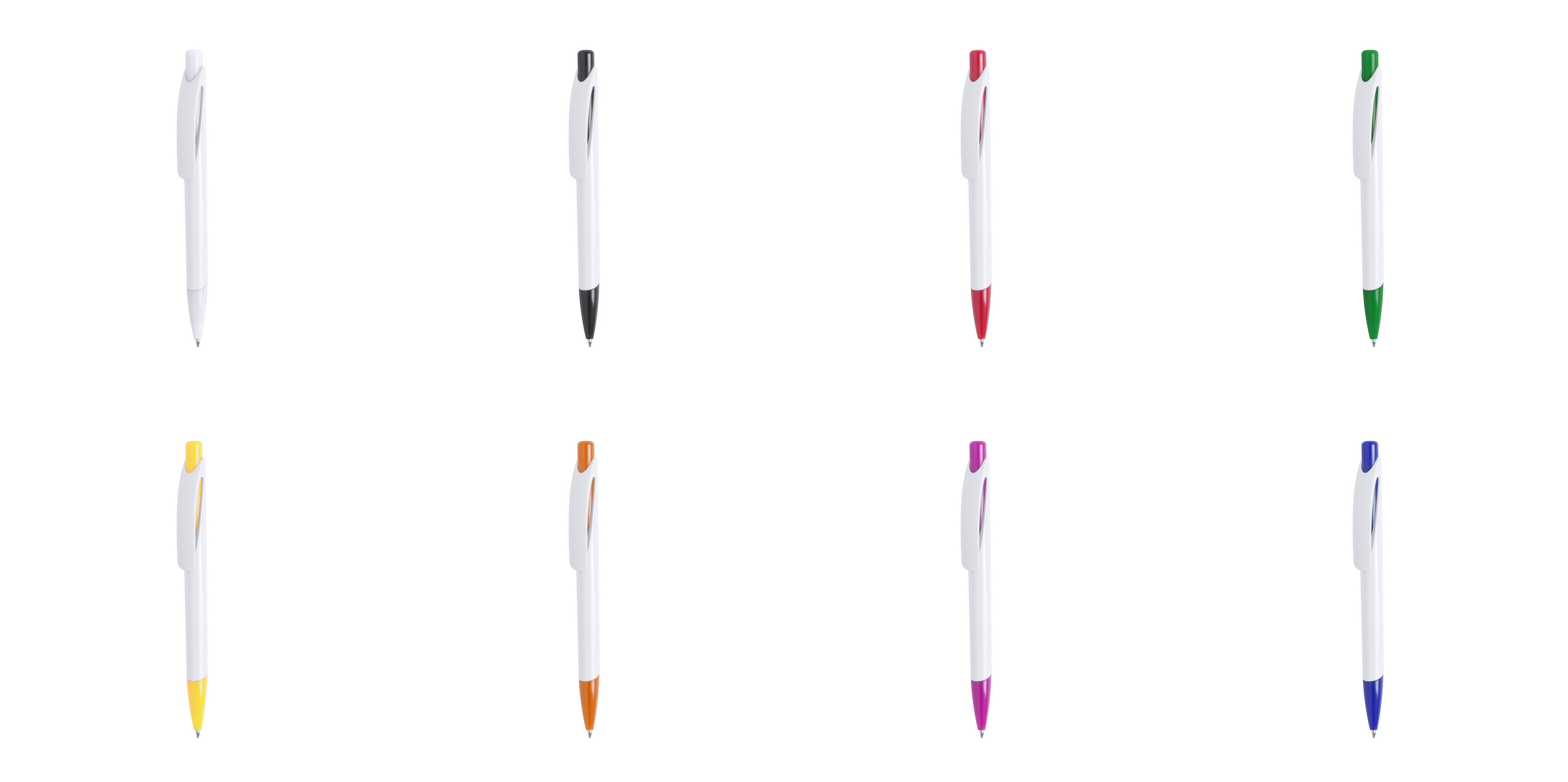 Bolígrafo de mecanismo pulsador de atrevido diseño bicolor con accesorios en vivos colores sólidos y cuerpo de suave acabado en color blanco sólido. Con original clip curvado a y punta a juego. Tinta azul.