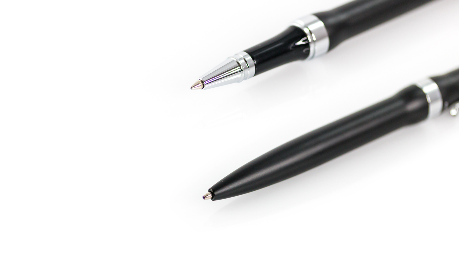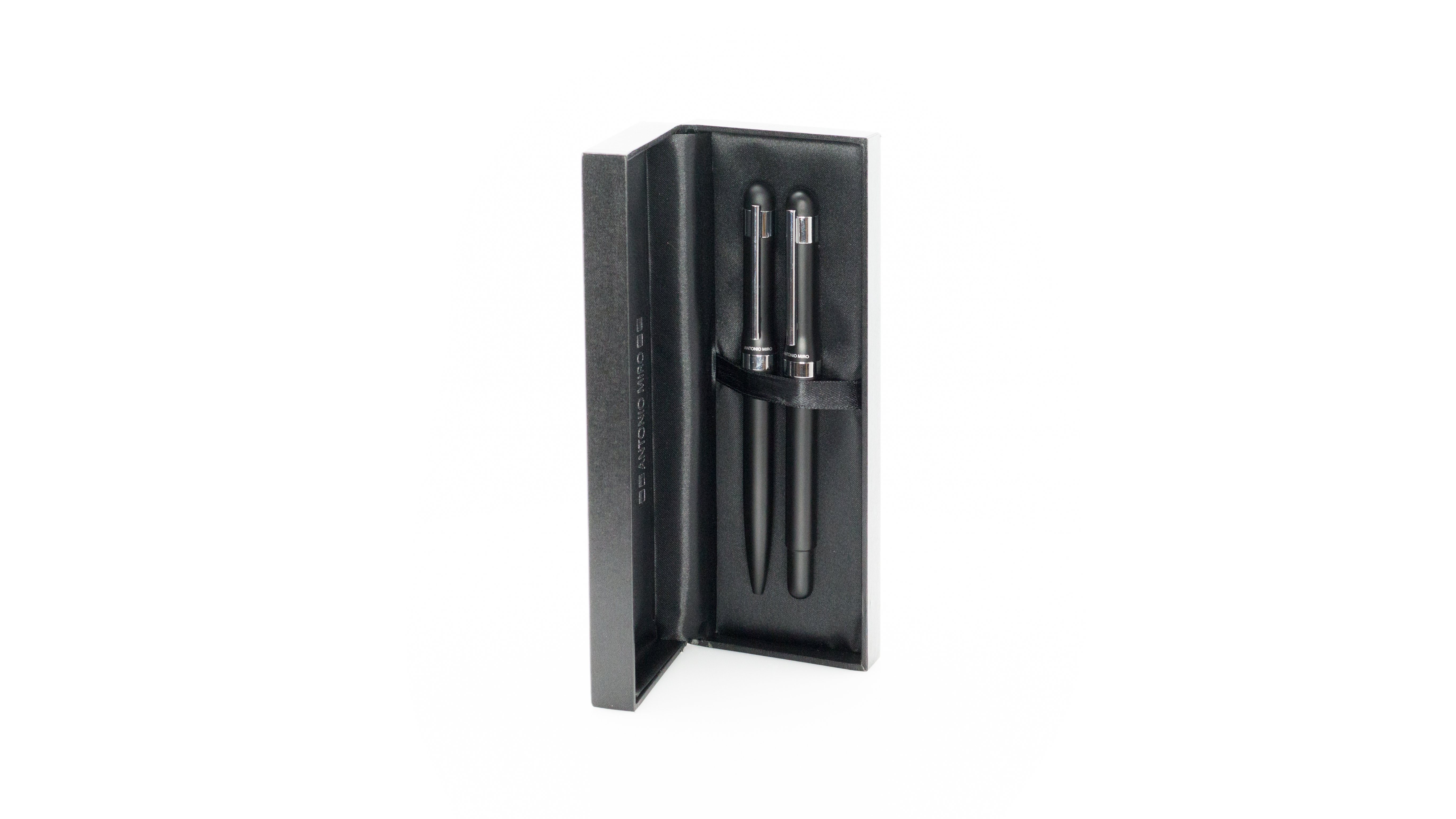 Elegante set de Antonio Miró con bolígrafo de mecanismo giratorio y roller de capucha y original anilla en sobrio diseño. De cuerpo metálico en acabado negro brillante con clip plateado. Presentado en elegante estuche individual en color negro con logotipo de la marca y funda. En tinta azul.