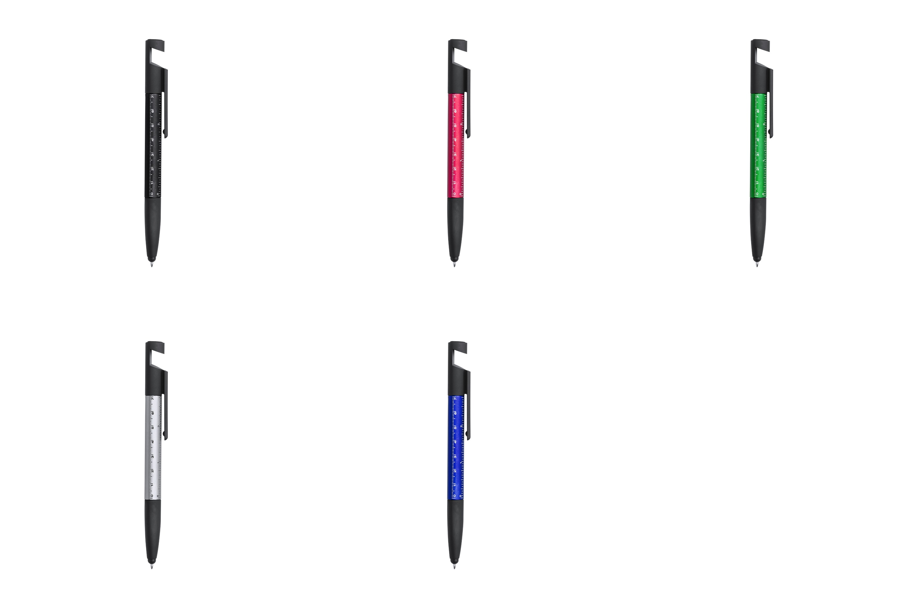 Bolígrafo 7 en 1 de mecanismo giratorio en variada gama de vivos colores. Con soporte para dispositivo móvil, puntero, limpiador de pantalla, regla integrada en cuerpo -cm y pulgadas-, destornilladores de punta plana y de estrella. Tinta azul.