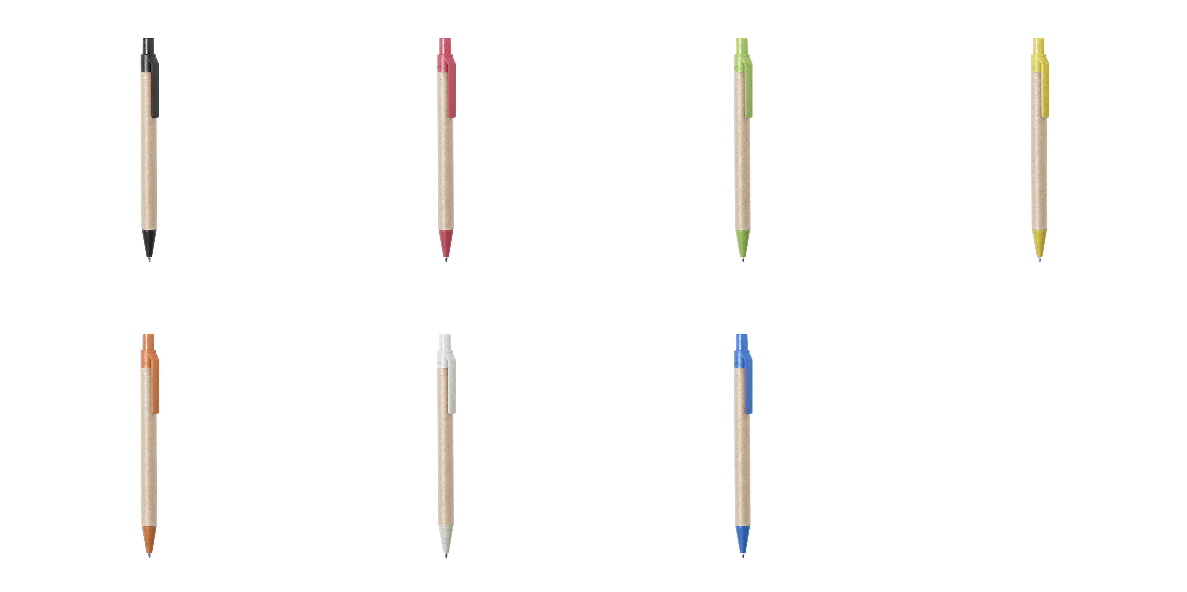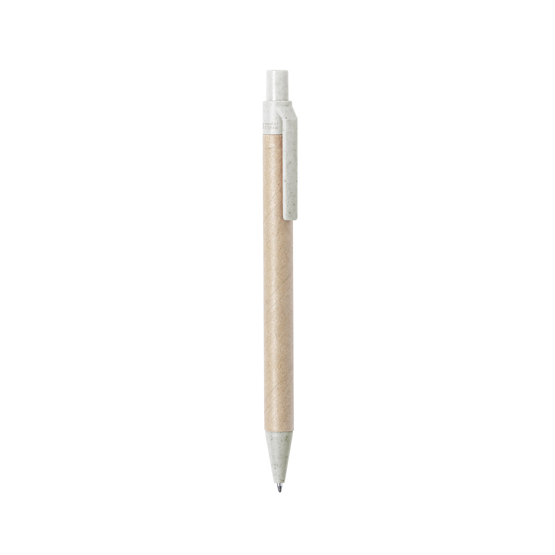 Bolígrafo de línea nature con mecanismo pulsador. Combinación de cuerpo en cartón reciclado de color natural y accesorios en caña de trigo y ABS , para así fomentar la utilización y reciclado de materias primas, reduciendo así las emisiones contaminantes. Disponible en variada gama de colores, con tinta azul. Distintivo Wheat Straw en la parte superior del bolígrafo.