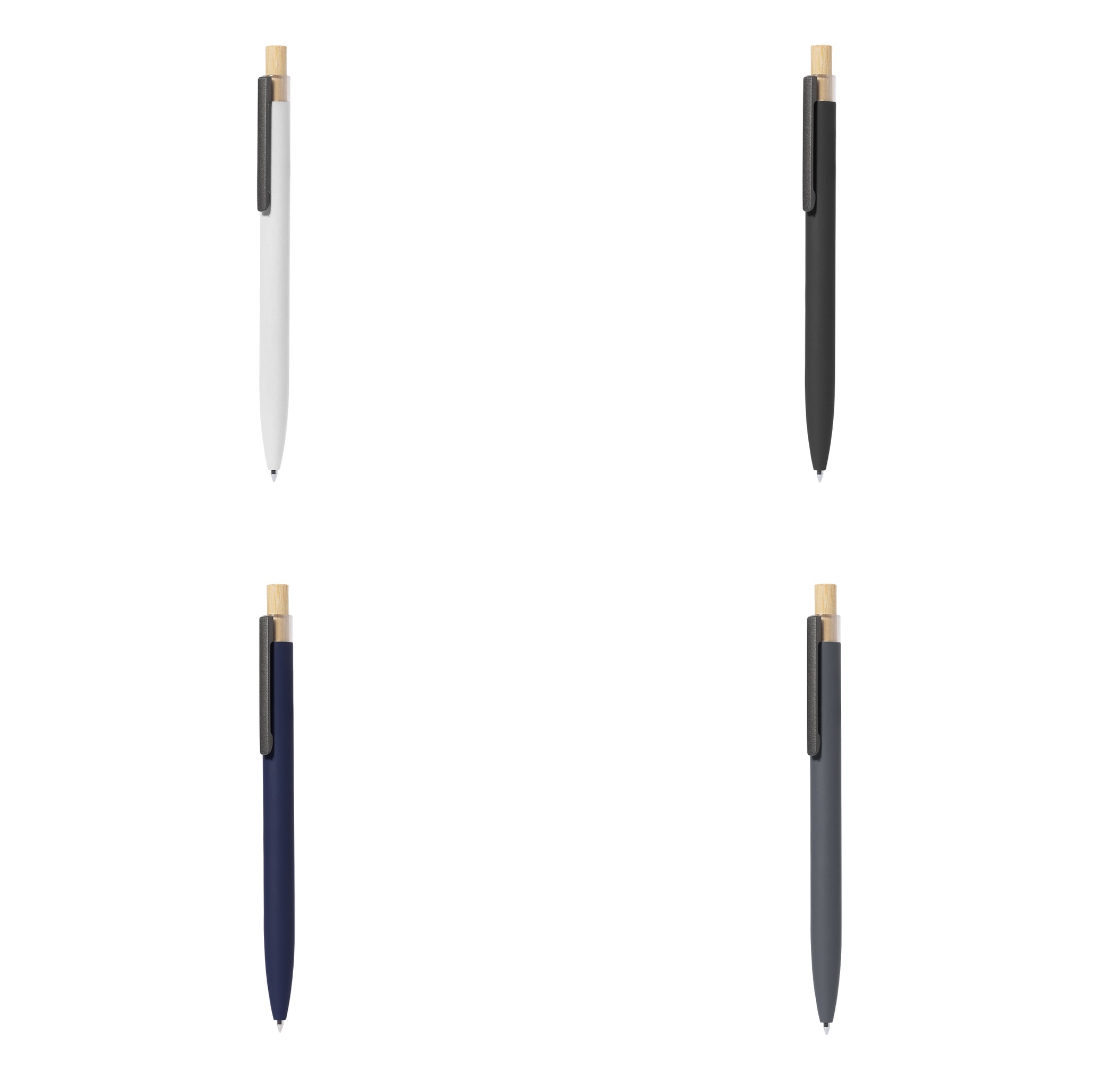 Bolígrafo de mecanismo pulsador fabricado en aluminio reciclado. Pulsador en bambú y cuerpo acabado goma, disponible en variada gama de elegantes colores. Clip metálico y distintivo aluminio reciclado en la parte superior del bolígrafo. De cartucho jumbo y en tinta azul. Presentado en bolsa individual reciclada. El aluminio reciclado es un material con posibilidades de reciclaje casi infinitas, sin perder sus propiedades originales y consumiendo menos energía en este proceso. Certificación GRS (Global Recycled Standard / Estándar de Reciclaje Global), que garantiza el origen reciclado del material usado para fabricar el producto.