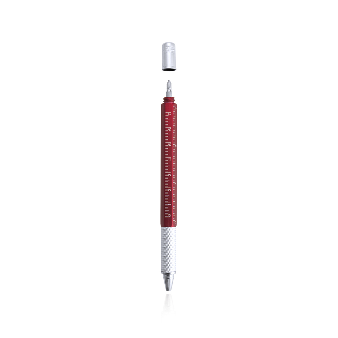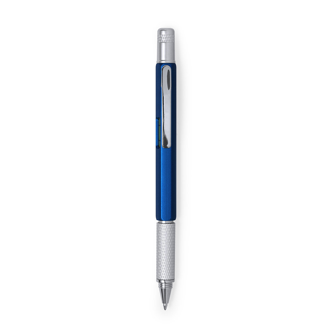 Bolígrafo multiherramienta 4 en 1 de mecanismo giratorio, en variados colores y con suave empuñadura. Con nivel integrado en cuerpo, regla con sistema métrico en centímetros/pulgadas y destornillador de doble cabeza -plana y de estrella-. Con clip metálico y tinta azul.