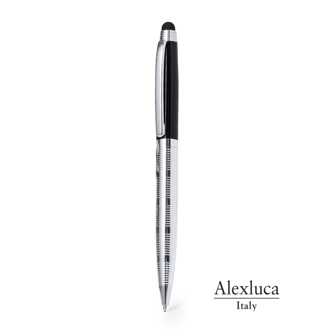 Bolígrafo puntero de Alexluca de mecanismo giratorio con suave cuerpo metálico, de elegante combinación de colores en plateado y negro. Clip y empuñadura de diseño a juego. Presentado en estuche individual negro con logotipo de la marca. Tinta azul.