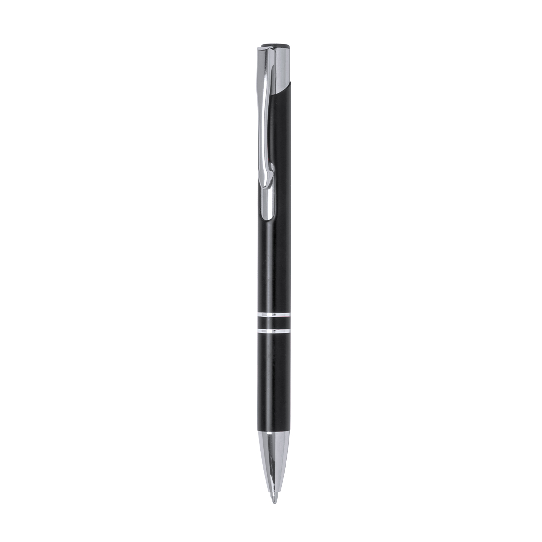 Bolígrafo de mecanismo pulsador fabricado en aluminio. Incluye accesorios plateados y clip, pulsador y punta a juego.En tinta negra.