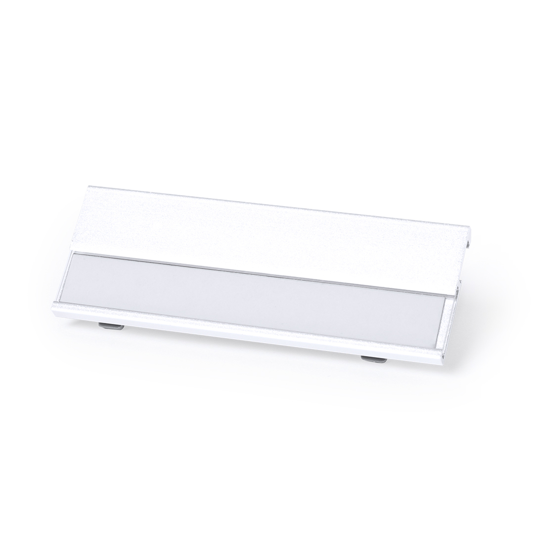 Identificador de aluminio en vivos colores y pinza trasera de enganche para una fijación segura.