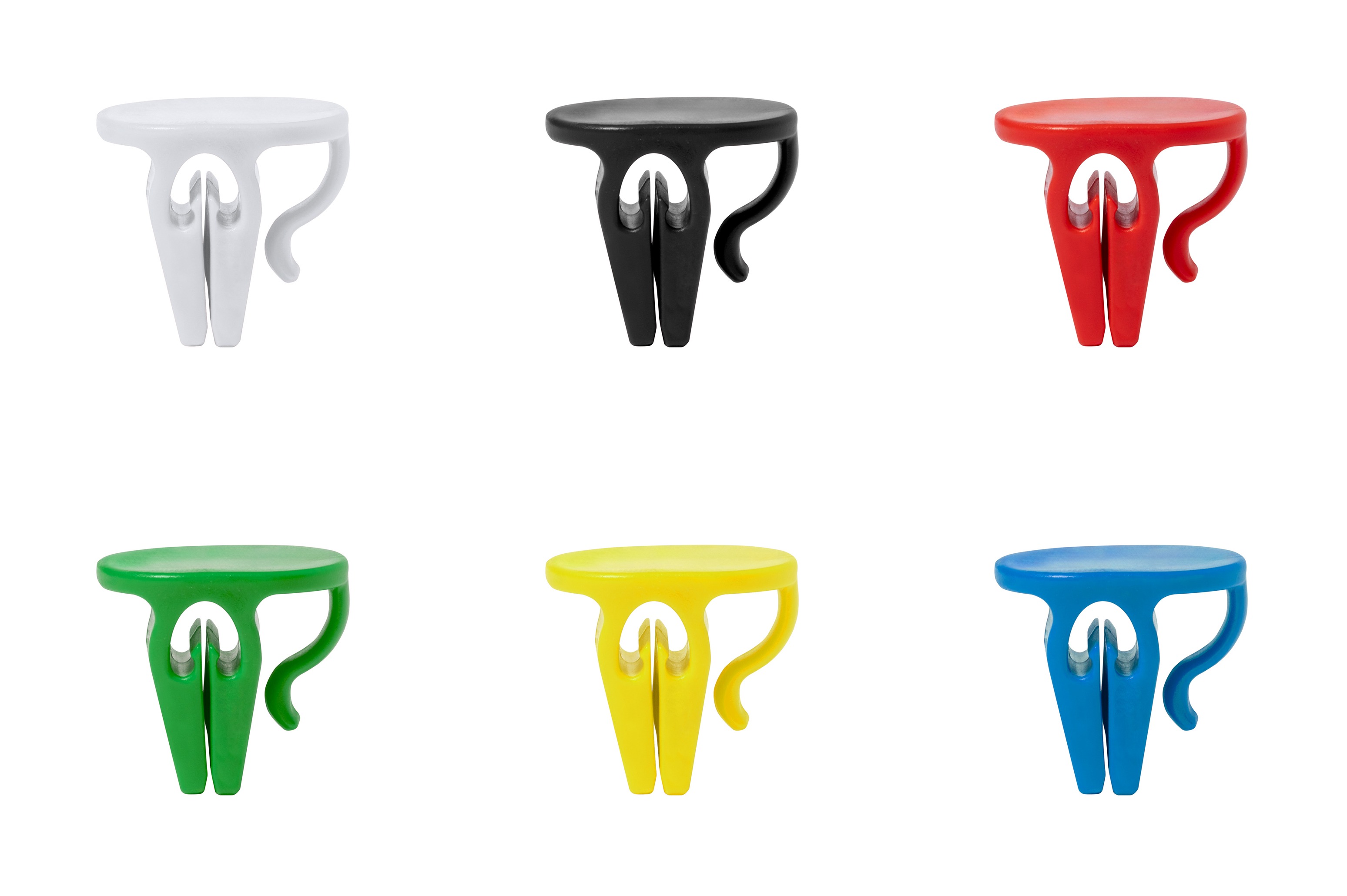 Práctica pinza portavasos fabricada en resistente ABS. Fácil de usar y adaptable a cualquier vaso. Con una superficie plana especial para personalización. Disponible en una variada gama de colores.