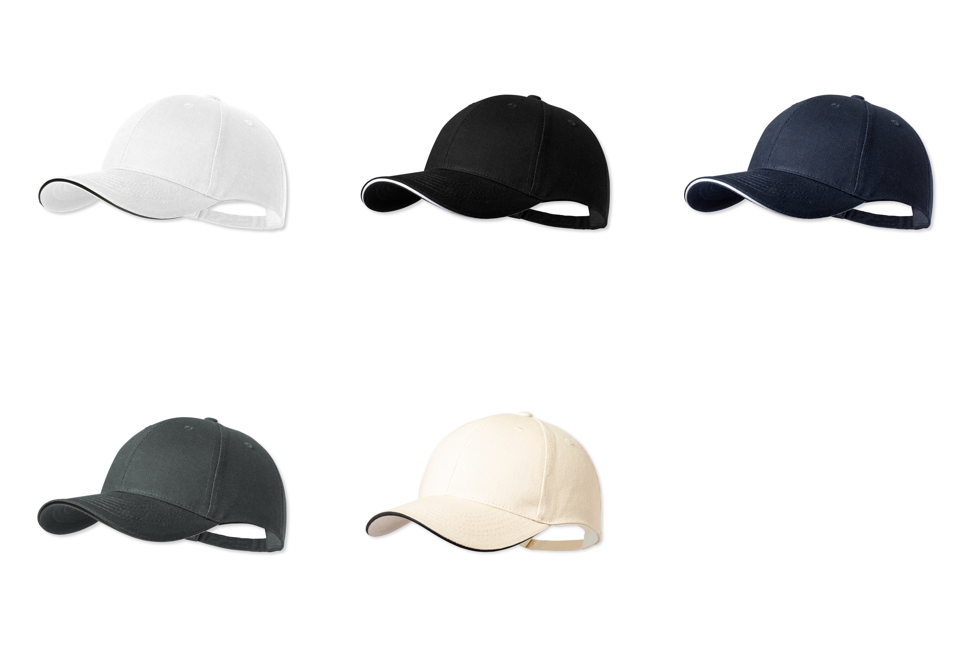 Gorra de 6 paneles fabricada en resistente algodón peinado de 250g/m2. Con sandwich en visera, orificios de ventilación bordados y cierre con hebilla metálica.