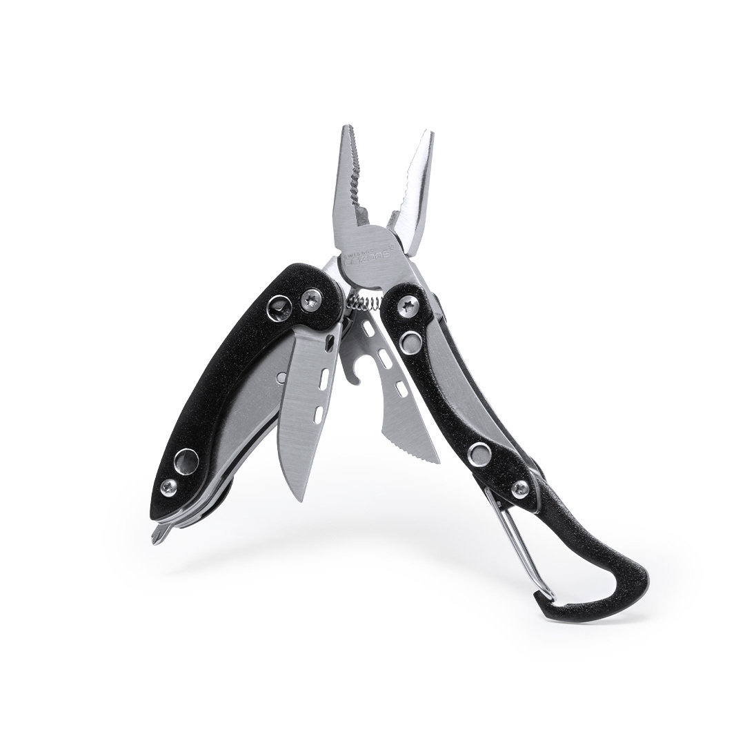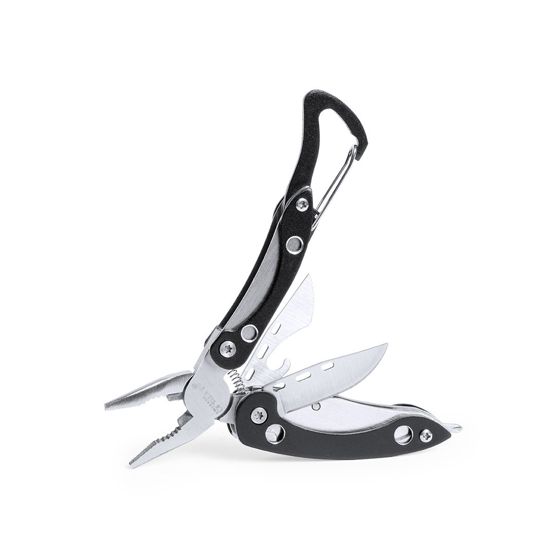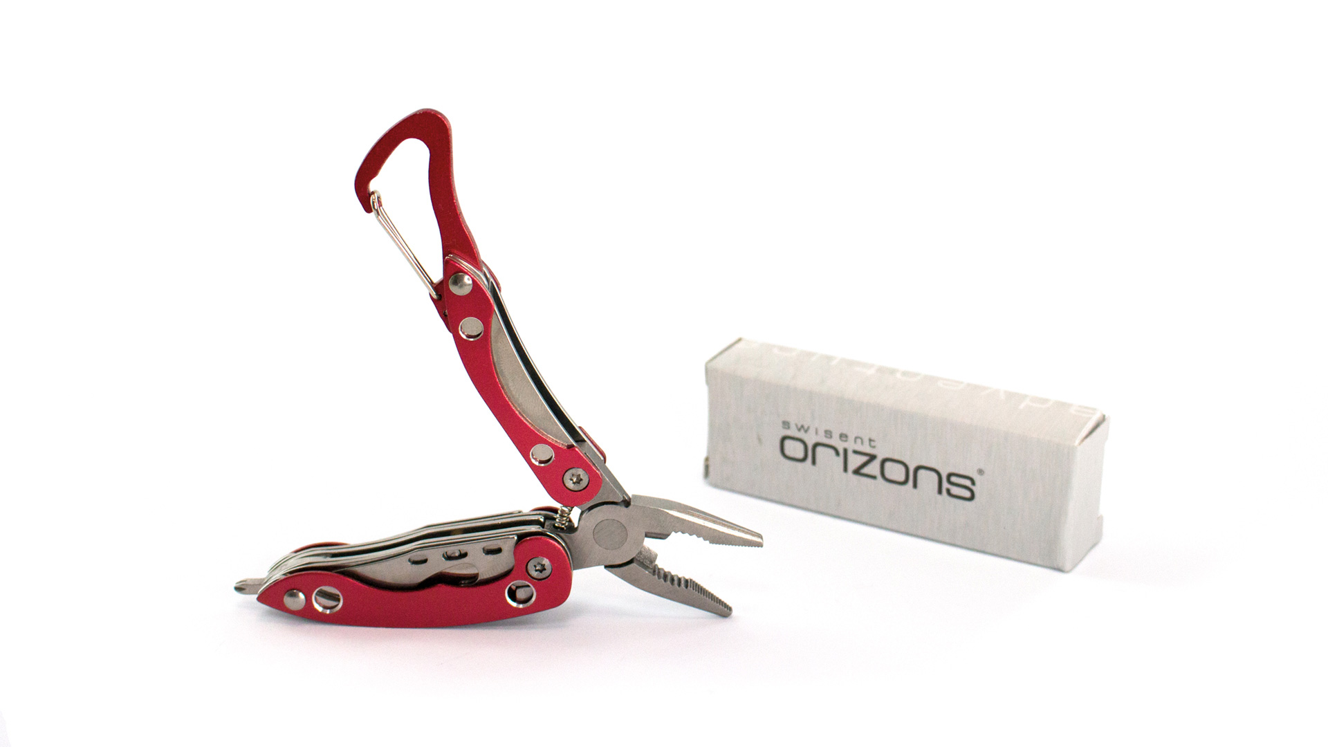 Multiherramienta de orizons con accesorios de acero inox de 6 funciones y mango de aluminio en vivos colores. Con alicates, navaja, abrelatas con destornillador de punta plana con función abrebotellas, destronillador de punta de estrella y mosquetón de acople. Presentada en atractiva caja de diseño con logotipo de la marca.