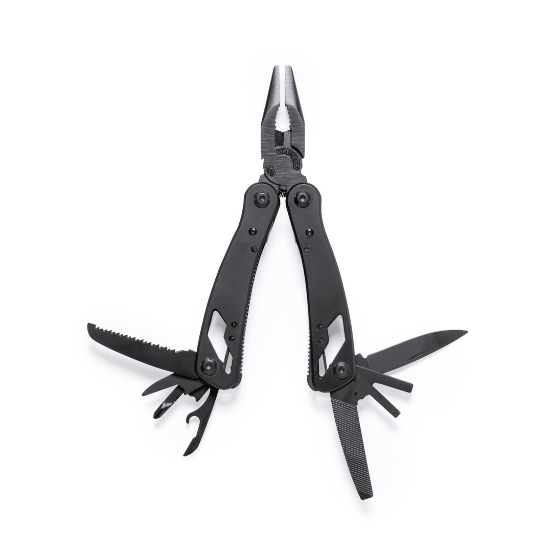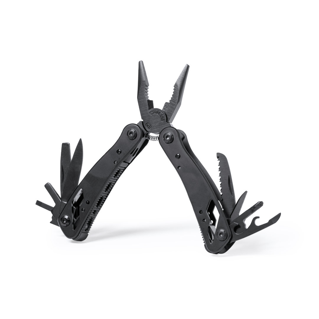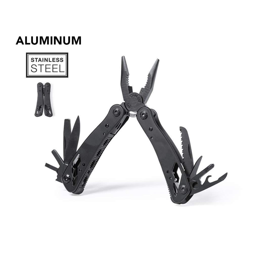 Multiherramienta con accesorios en acero inox de acabado negro y resistente empuñadura a juego en aluminio. Con 12 funciones, entre ellas cuchillo y navaja; destornillador, lima; abridor y alicates. Plegable y de tamaño compacto, presentada en caja individual de diseño negra.