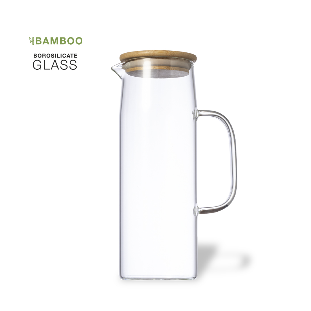Jarra de 1,25 l de capacidad, fabricada en cristal de borosilicato, que ofrece una resistencia y durabilidad excepcionales, alargando su vida útil y pudiendo ser reutilizada infinidad de veces. Tapón en bambú con ajuste a presión. Presentado en caja individual de diseño kraft.