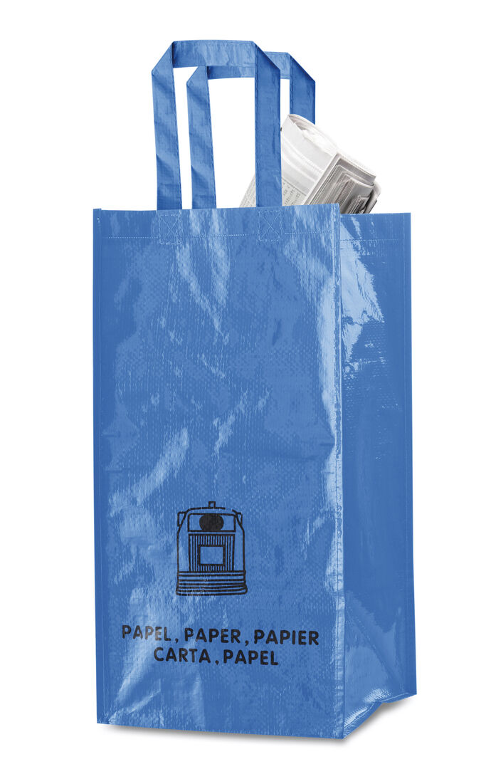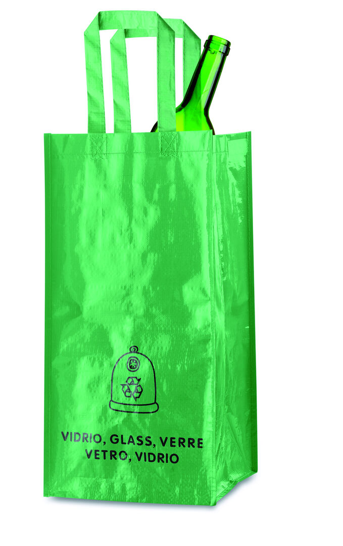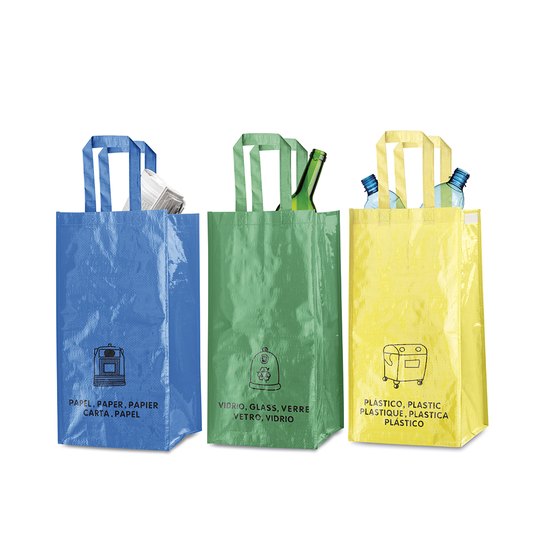 Set de 3 bolsas de reciclaje amarilla-verde-azul en resistente pp-woven laminado de 125g/m2 de acabado brillante. Incluye 3 bolsas de 23x45x23cm unidas entre sí mediante resistentes velcros laterales. Con asas reforzadas e indicación de tipos de residuo: plástico y envases, vidrio y papel.