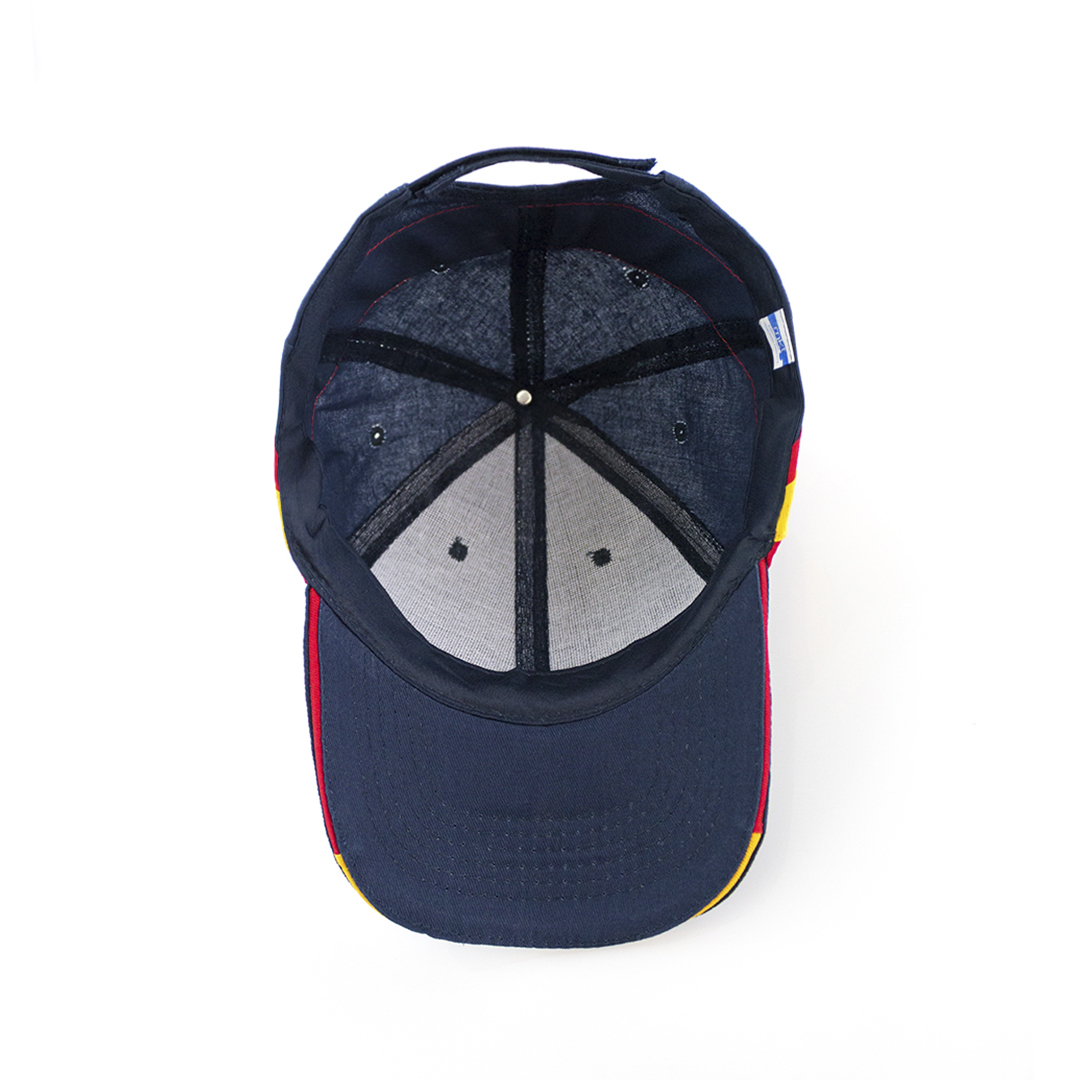 Gorra de diseño bandera nacional en material 100% algodón peinado. De 6 paneles, con sandwich tricolor y accesorios de bandera en laterales y parte trasera. Con orificios de ventilación bordados y cierre ajustable de velcro.