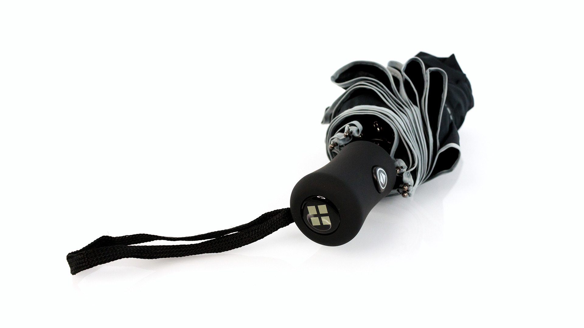 Paraguas plegable de Antonio Miró, de 8 paneles y elegante diseño en color negro con ribetes en color blanco. De 95cm de diámetro, con mecanismo automático de apertura y cierre, sistema antiviento y en resistente material pongee. Con varillas metálicas en color negro, cierre de velcro y mango ergonómico con cinta de transporte. Presentado en funda individual a juego con logotipo de la marca.