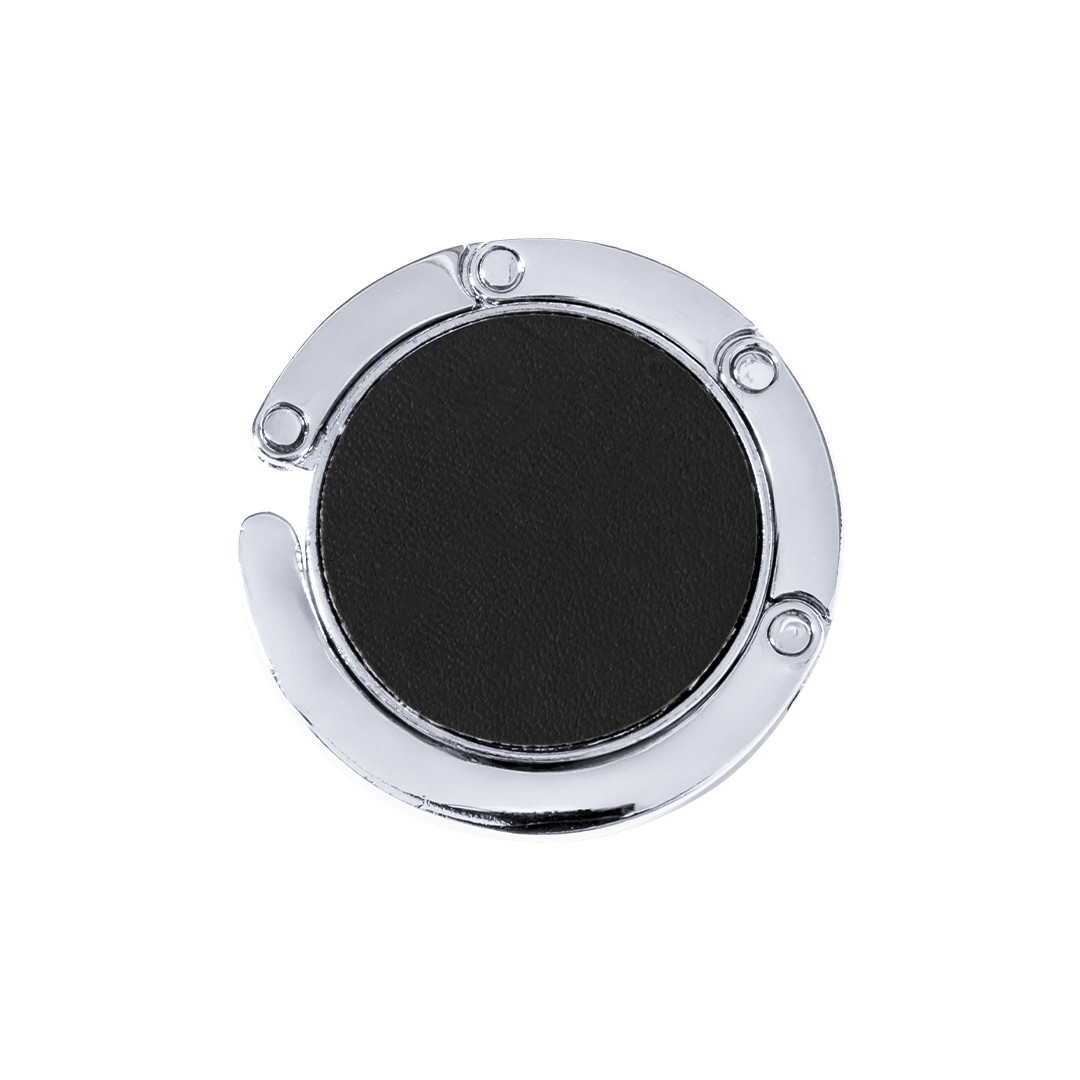 Cuelgabolsos metálico plegable con corona en polipiel de vivos colores. Presentado en estuche individual con interior troquelado.