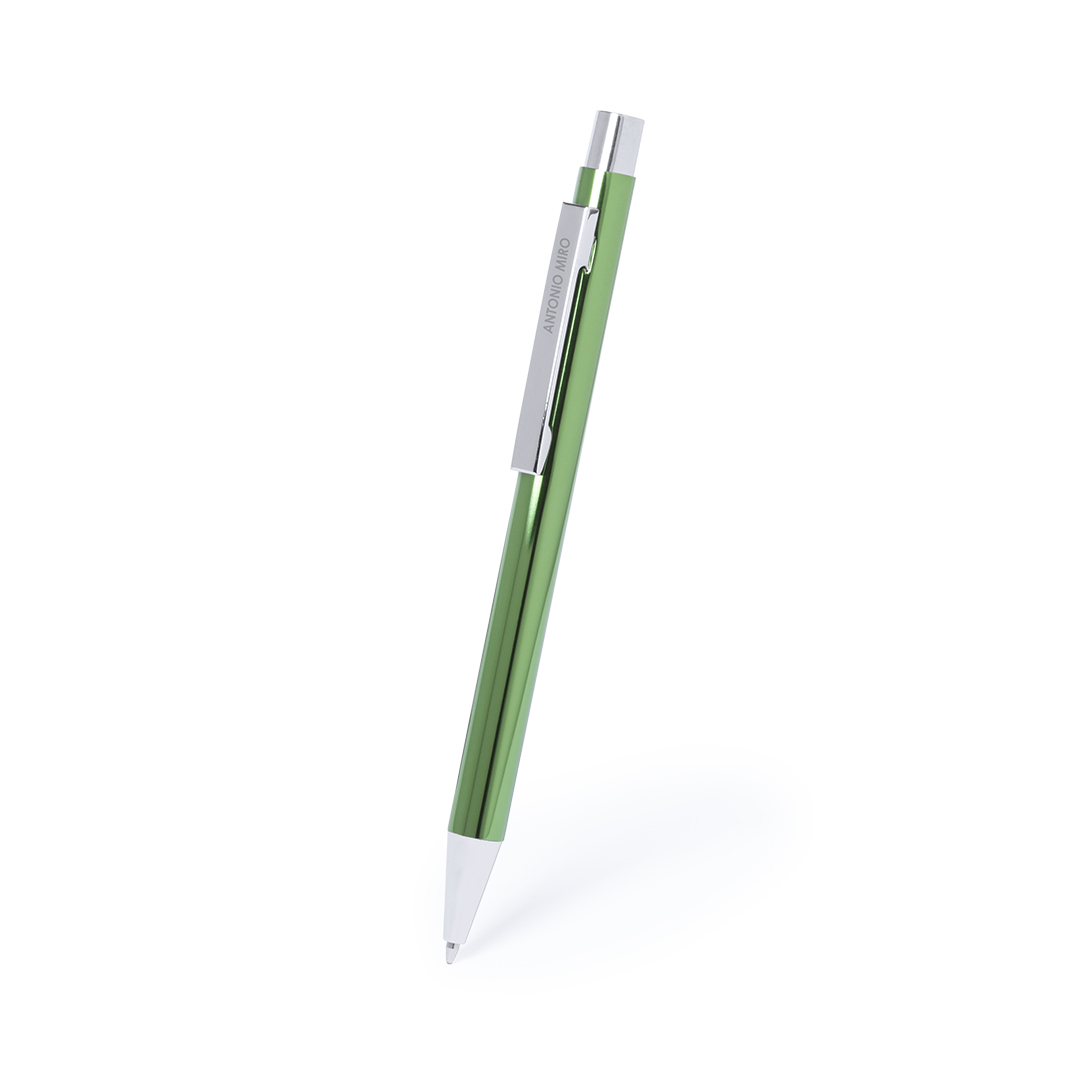 Bolígrafo de Antonio Miró con cuerpo en aluminio de variada gama de vivos colores y en color plateado. De mecanismo pulsador y presentado en bolsita don logotipo de la marca. Tinta azul.