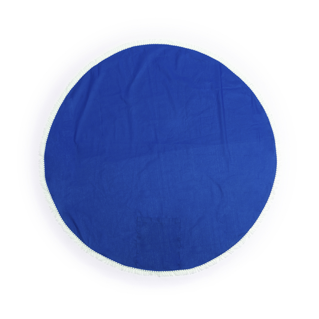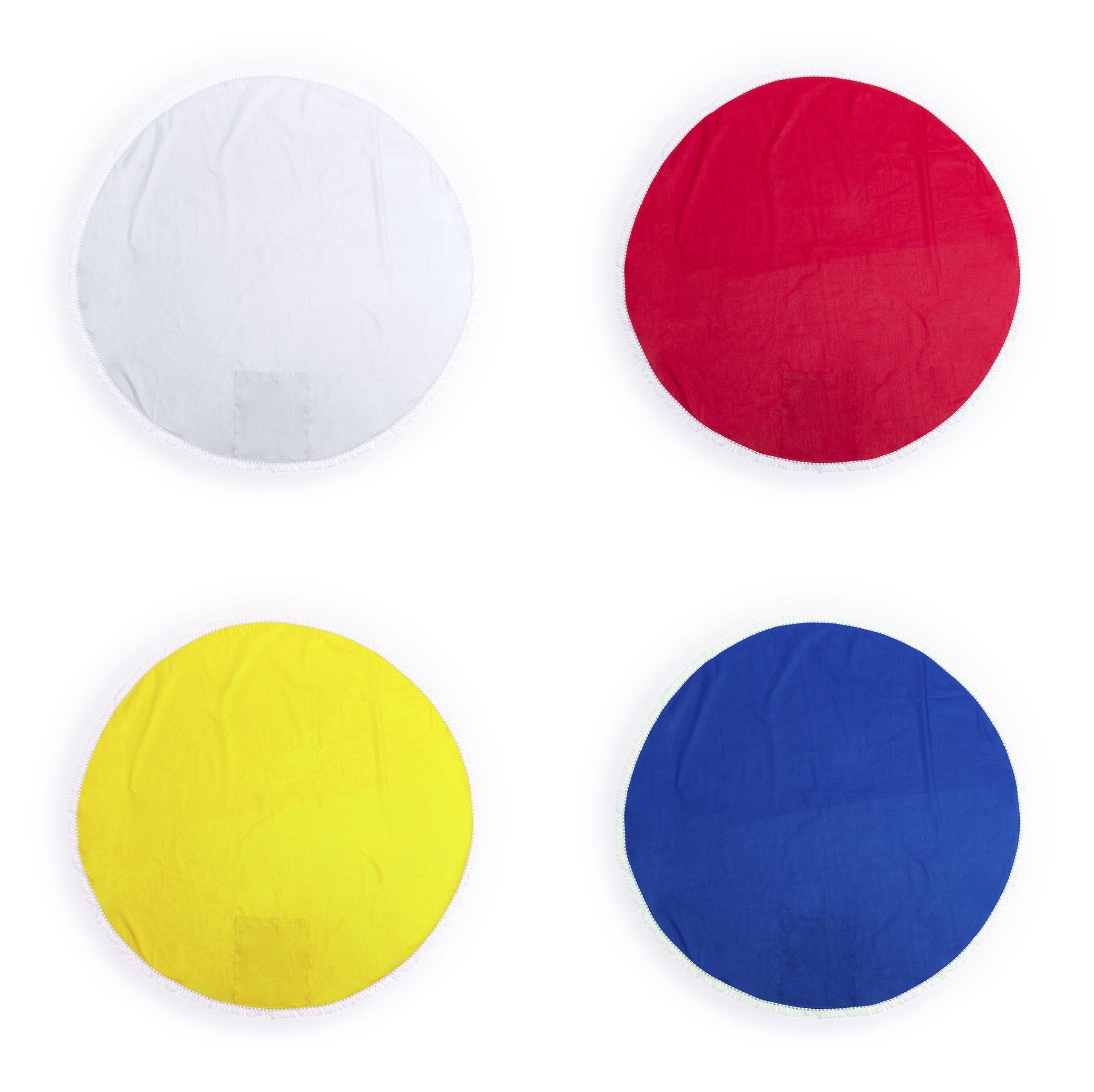 Esterilla en material 100% algodón de 125g/m2 en original diseño circular de vivos colores y terminación en flecos. *Para pedidos con impresión, se debe incrementar el coste del marcaje + 0,20 / unidad en concepto manipulación especial*