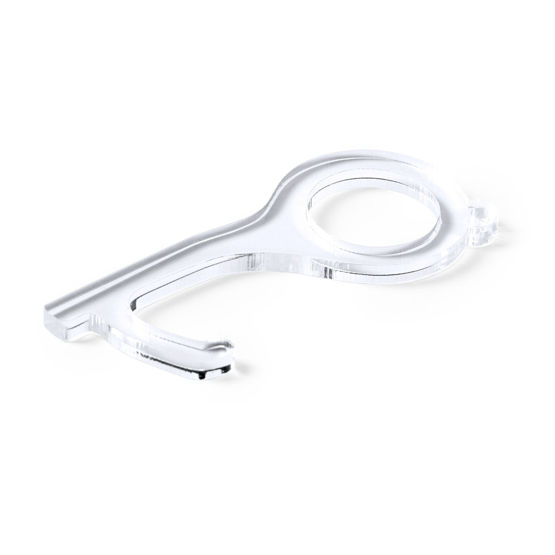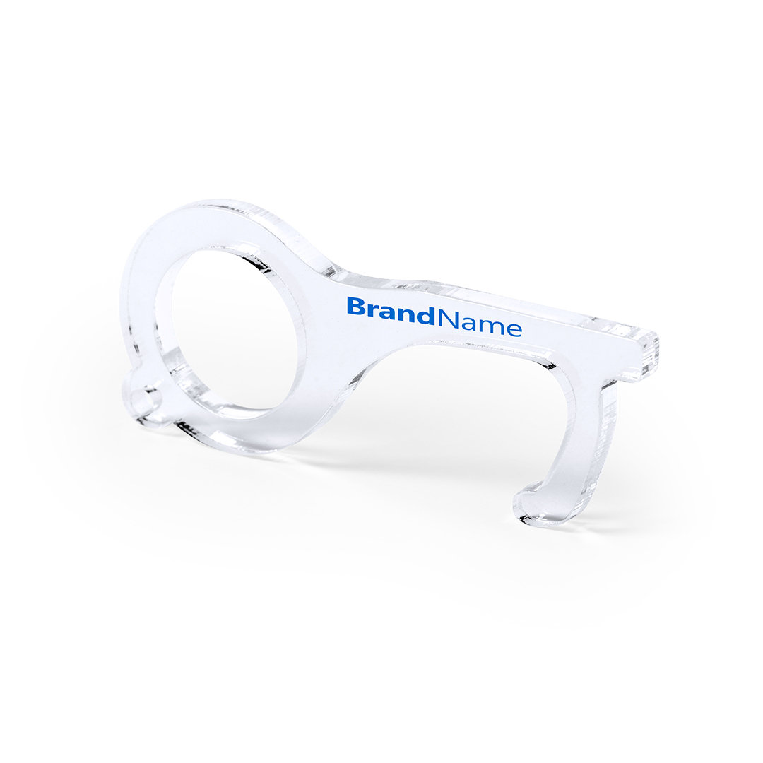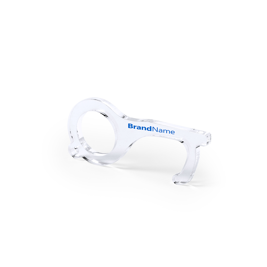 Llavero higiénico anti-contacto, fabricado en original y resistente material acrílico de acabado transparente. Especialmente diseñado para evitar tocar con las manos superficies de uso común (manivelas de puertas, interruptores, grifos de uso público, cajeros automáticos...). Con cómodo troquel para el dedo y presentado en bolsa individual de diseño. Recomendado para marcaje en tampografía.
