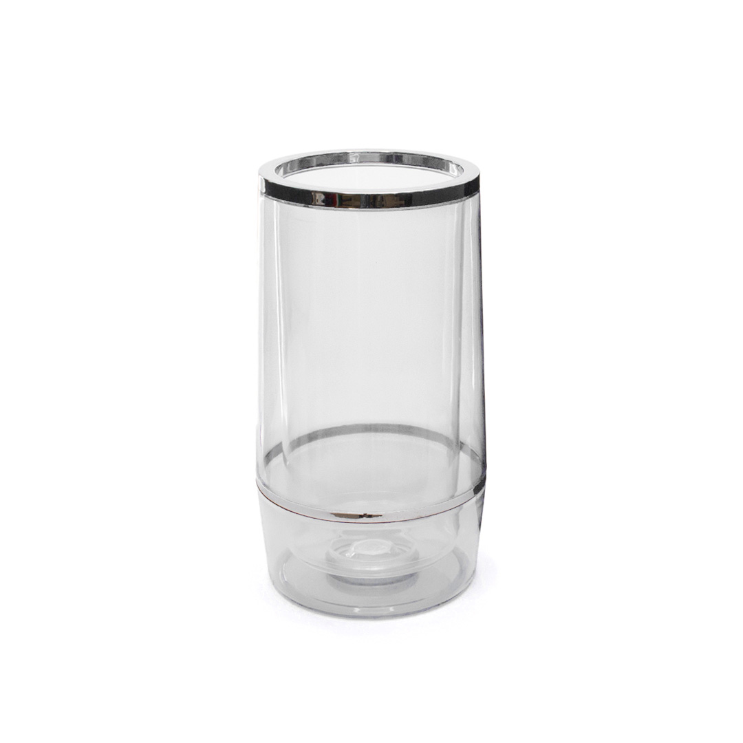 Botellero para botellas de vino de hasta 75 cl en original acabado transparente en variados colores. Con anillas en color plateado brillante y base adaptada para botella. Presentado en caja individual.