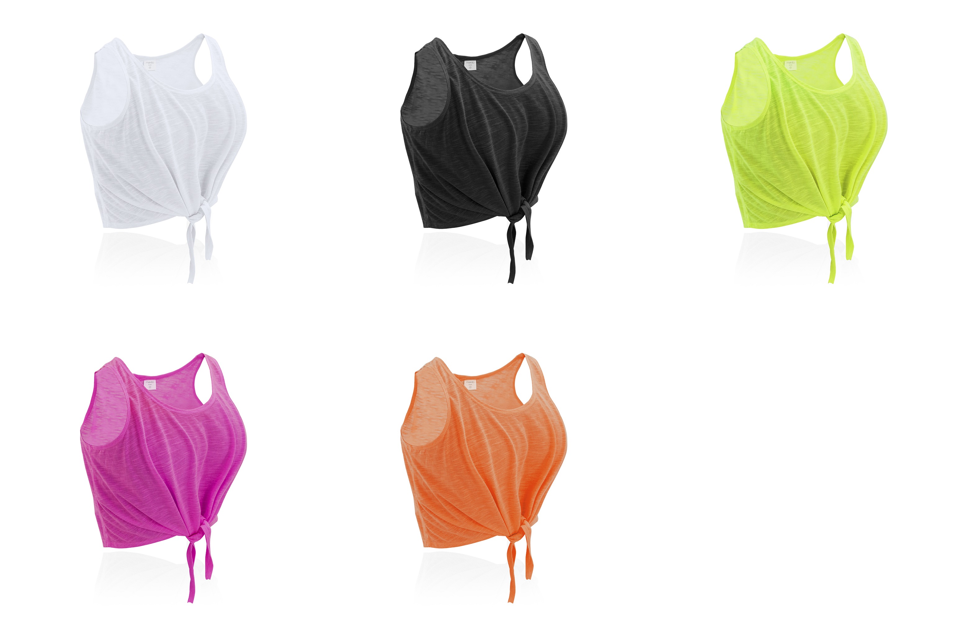 Camiseta para chica en suave poliéster de 130g/m2. Con diseño en tirantes y con cierre frontal de nudo. Disponible en blanco y variada gama de vivos colores fluorescentes. Tallas S, M, L.