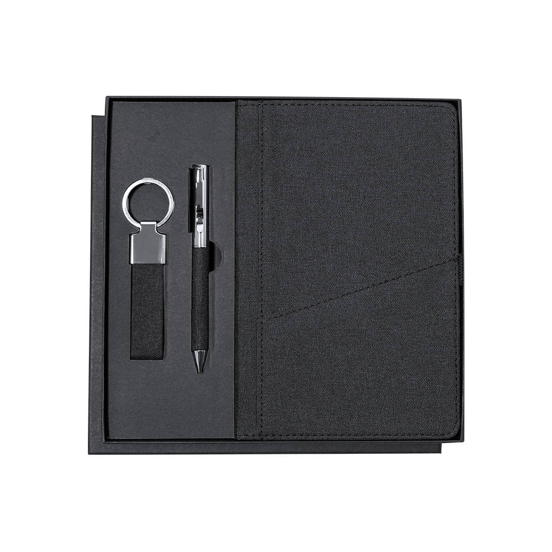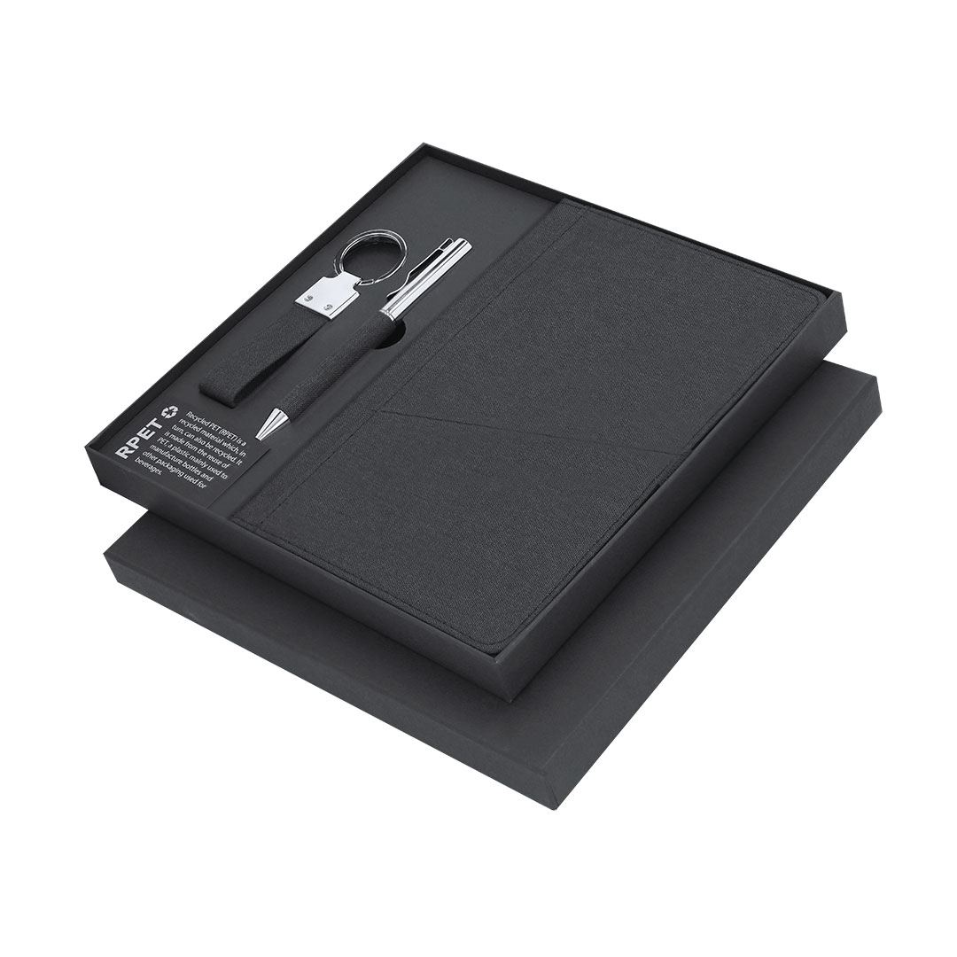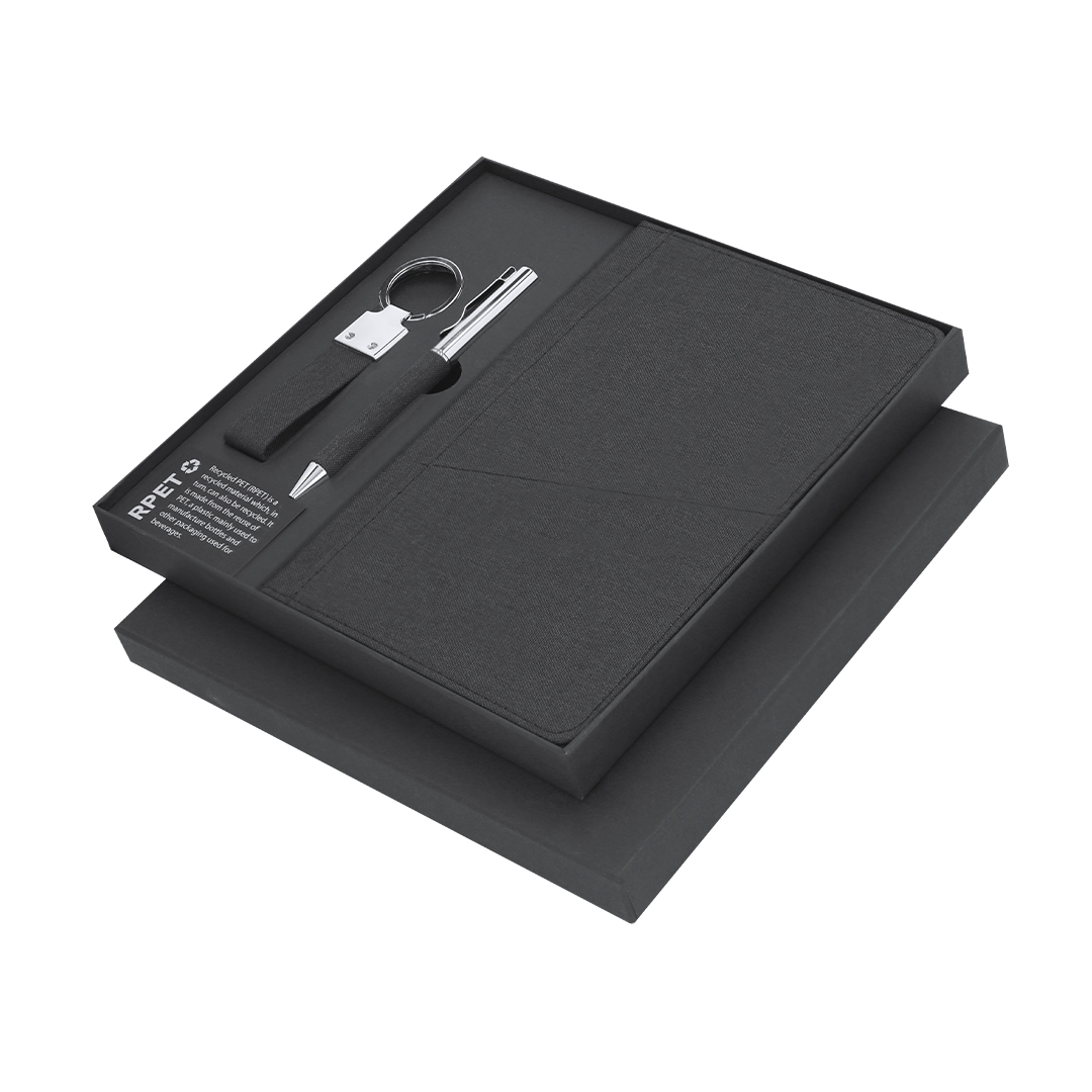Elegante set premium que incluye:Bloc de notas en RPET en elegante color negro. Incluye cierre elástico, bolsillo frontal y marcapáginas de tela. Interior con 80 hojas de disposición a una raya. Bolígrafo en RPET de acabado negro mate, de mecanismo giratorio y tinta azul. Con clip y puntera en pulido metal.Elegante llavero con cinta fabricada en poliéster RPET 300D y accesorios cromados.Set presentado en estuche individual de acabado mate, con troquelado interior para cada uno de los elementos del set y tarjeta de RPET en el interior.El material RPET se elabora a partir de plástico reciclado, para así fomentar la reutilización de residuos plásticos y ayudar a la sostenibilidad del planeta.