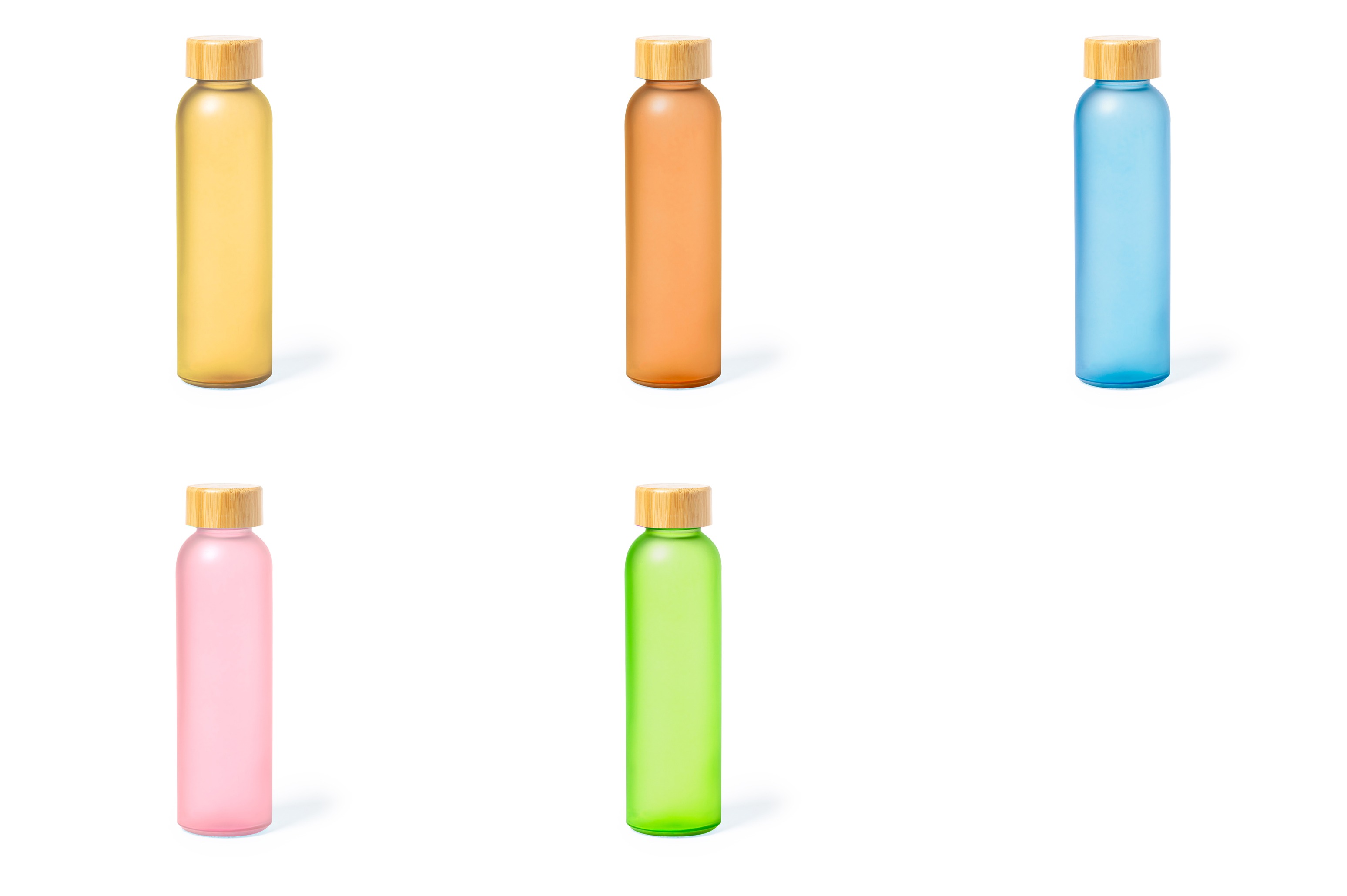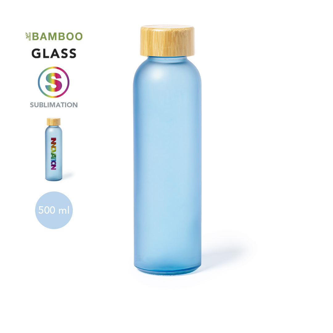 Bidón para sublimación de cristal con 500 ml de capacidad. Tapón a rosca de bambú y libre de BPA. Especialmente diseñada para marcaje en sublimación. Disponible en variada gama de colores mate. Presentado en caja individual de diseño kraft..Materiales como el bambú fomentan la utilización de materias primas naturales, reduciendo las emisiones contaminantes. Proviene de una planta de gran resistencia y versatilidad, con crecimiento y regeneración rápidos, siendo una excelente alternativa al uso de madera tradicional.