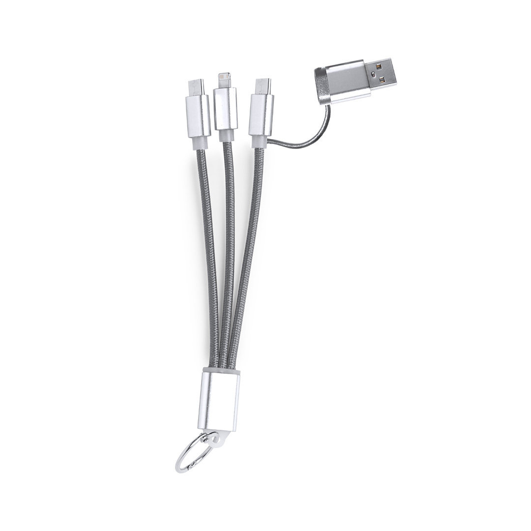 Cable cargador con conexión dual micro USB/Lightning y tipo C (entrada y salida). Conectores de aluminio y chapa especialmente diseñada para marcaje en láser.