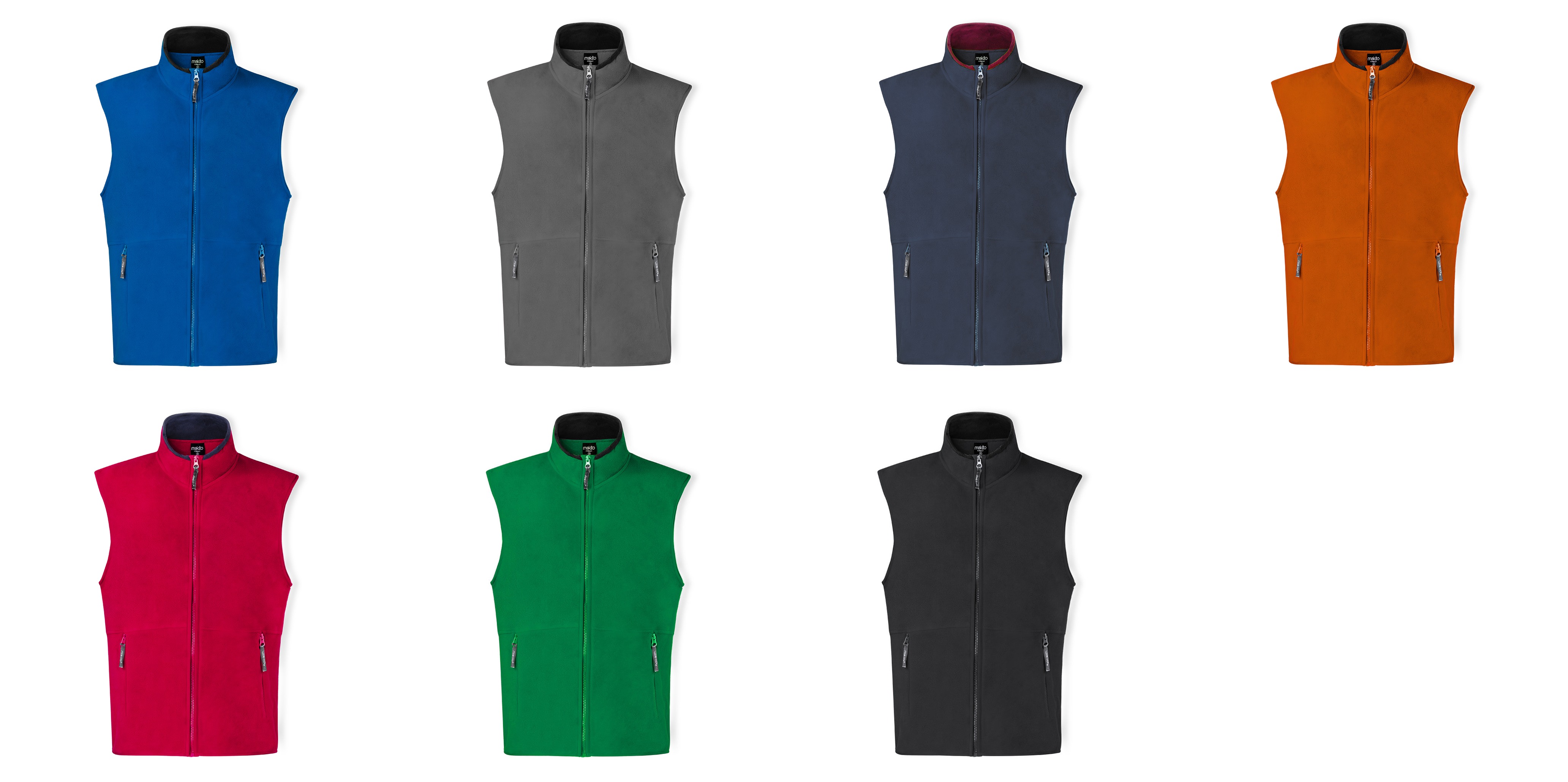 Chaleco en cálido y suave polar fleece de 280g/m2 con tratamiento anti-pilling. Con cuello de interior en color, cierre de cremallera con cinta en tirador, bolsillos laterales de cremallera y cintura elástica. Disponible en tallas M, L, XL, XXL.