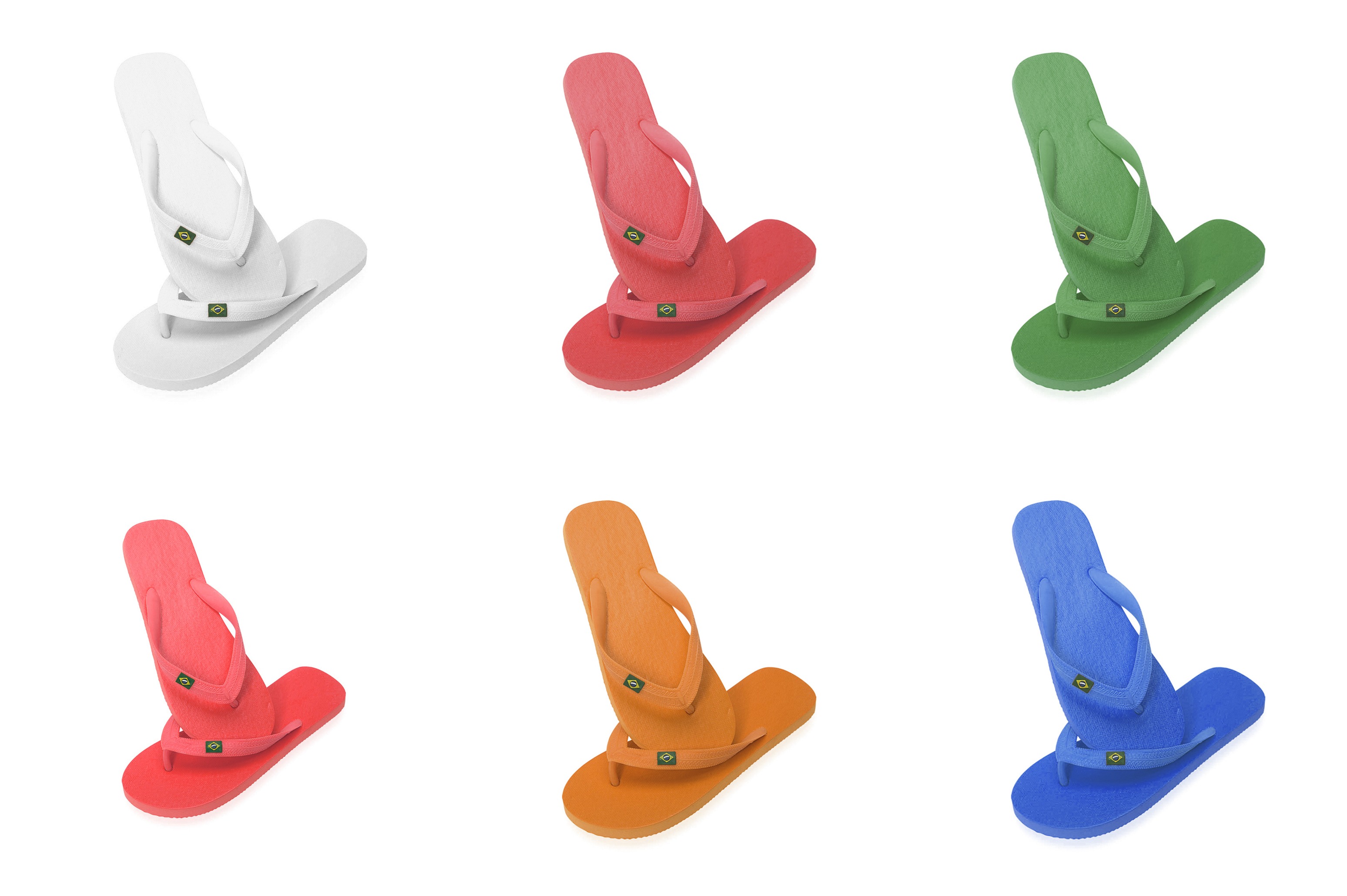 Par de chanclas con suela en resistente EVA y tira de PVC a juego con banderita brasileira. En variada gama de vivos colores y disponibles en tallas 36-38, 42-44.