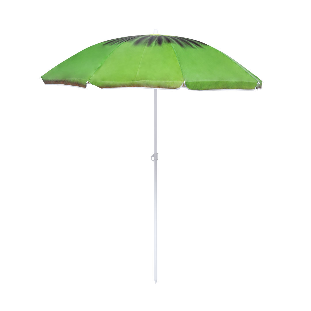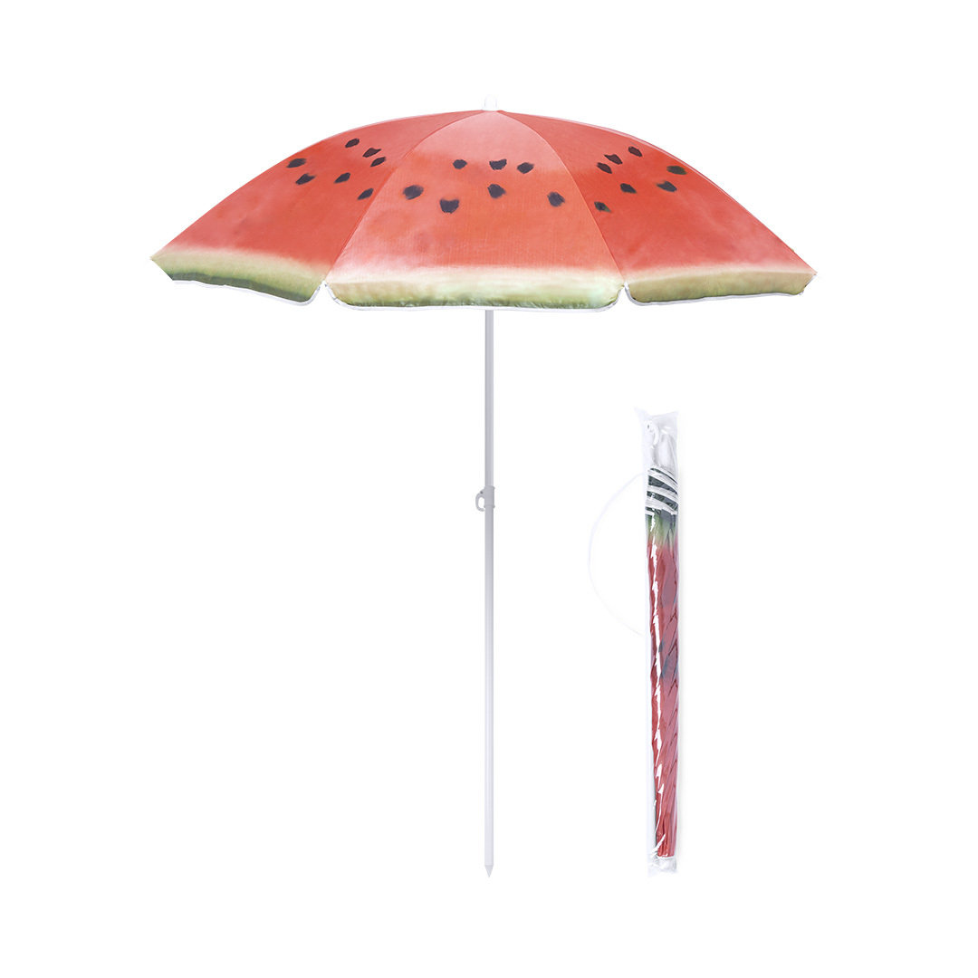 Colorida sombrilla de playa con diseños frutales. 150 cm de diámetro, con 8 paneles en resistente nylon y faldones laterales ribeteados. Tubos metalizados en color blanco y ajustable en altura. Presentada en funda transparente con cinta de transporte para hombro.