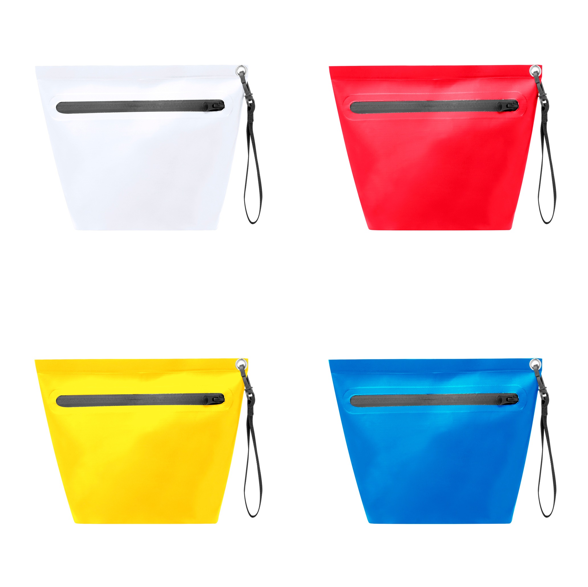 Portatodo impermeable fabricado en resistente pvc. Cierre de seguridad por cremallera con asa de transporte con mosquetón de plástico giratorio. Disponible en variada gama de colores con cremallera y asa de color negro.