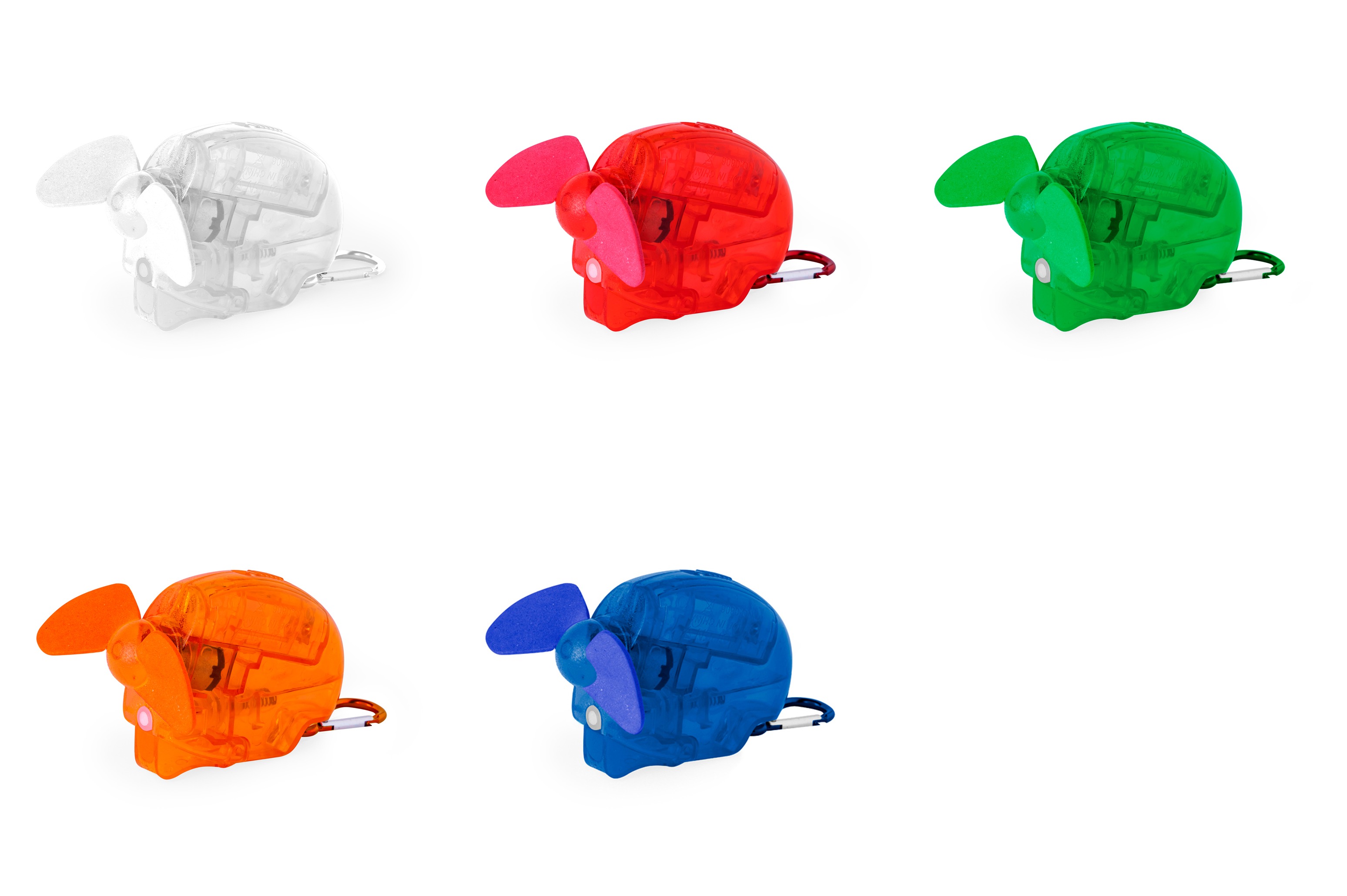 Ventilador vaporizador de 35 ml de capacidad. Presento con cuerpo translúcido y aspas de EVA. Se alimenta con 1 pilas AA (no incluidas). Disponible en colores variados, con un práctico mosquetón a juego. Presentado individualmente en caja.
