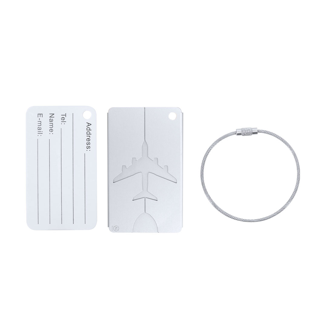 Original identificador de maletas con diseño de avión en resistente Aluminio Reciclado. Con cinta de acople en acero inoxidable con sistema de cierra en rosca y tarjeta de identificación en inglés con los siguientes campos impresos; Addres, Tel, Name, E-mail. Logo AL Recycled grabado por láser.